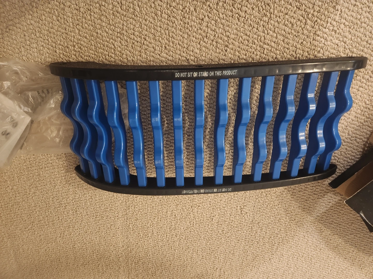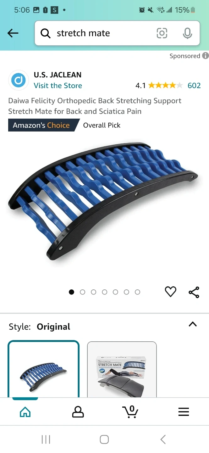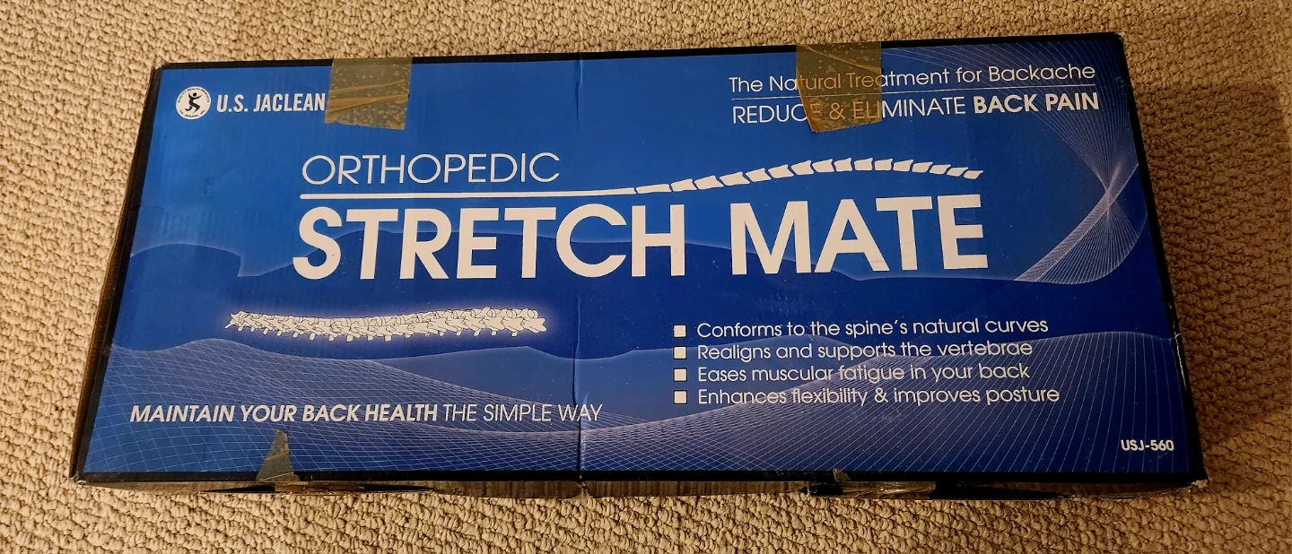 This is the Orthopedic Stretch Mate, designed to assist with stretching your back. It realigns and supports the vertebrae, helping to ease muscular fatigue and improve flexibility. It's made of durable blue plastic with a black frame.