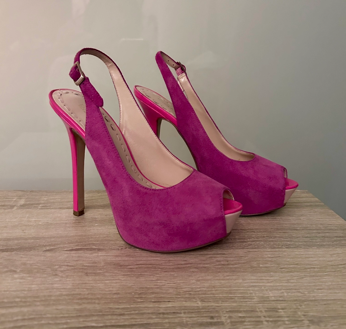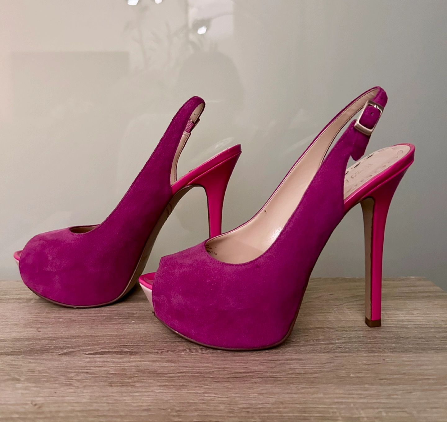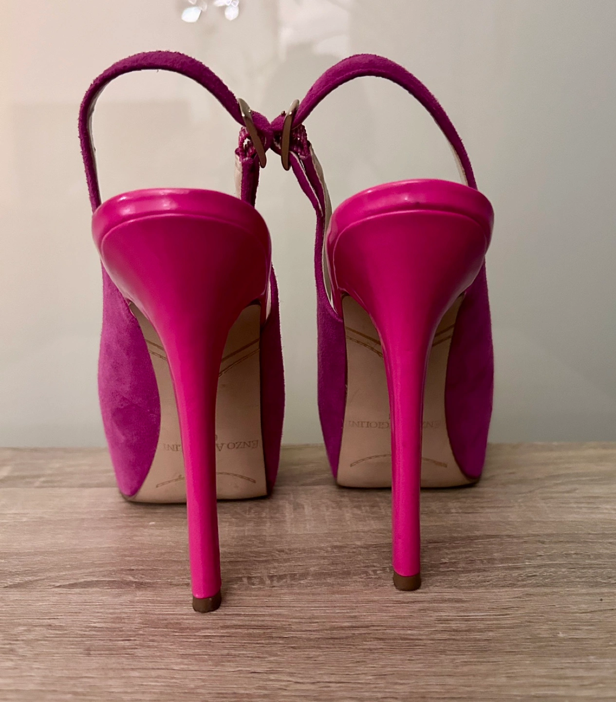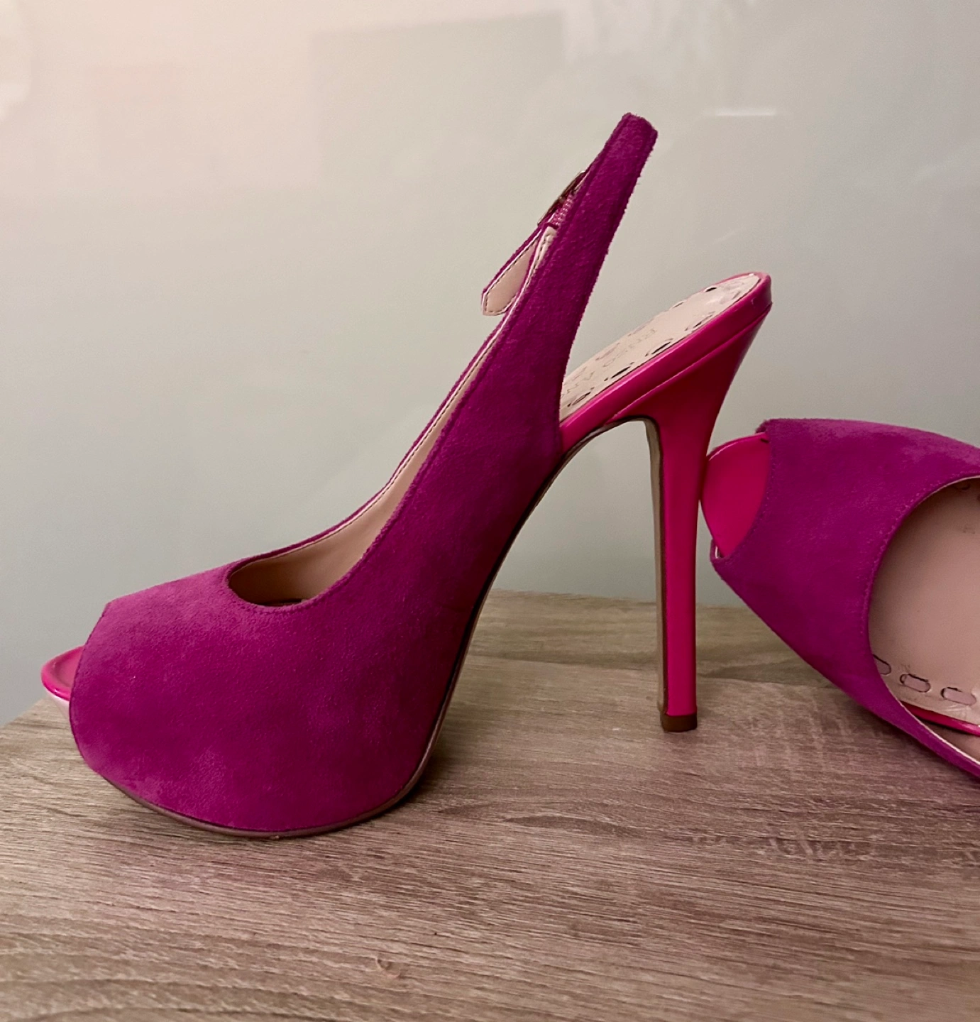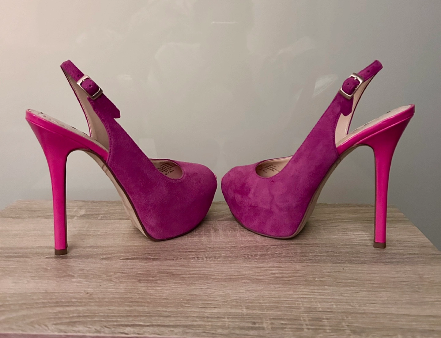 These elegant and sexy deep pink suede leather platform designer slingback heels are perfect for many occasions π