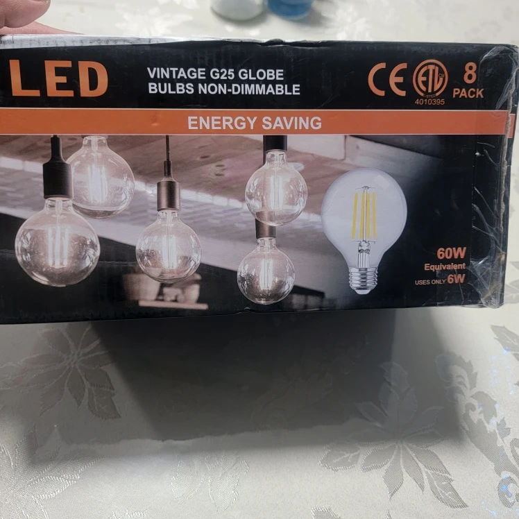 These are non-dimmable LED vintage G25 globe bulbs. They offer energy savings, with each bulb using only 6W while providing a 60W equivalent light. Comes in an 8-pack.