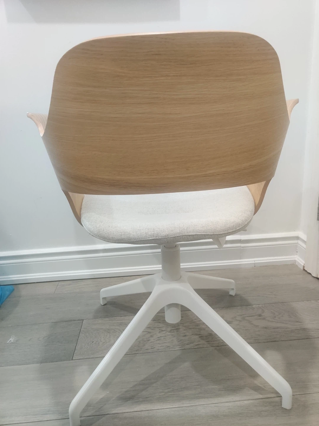 Office chair with a natural wood-look back and a light grey fabric seat.