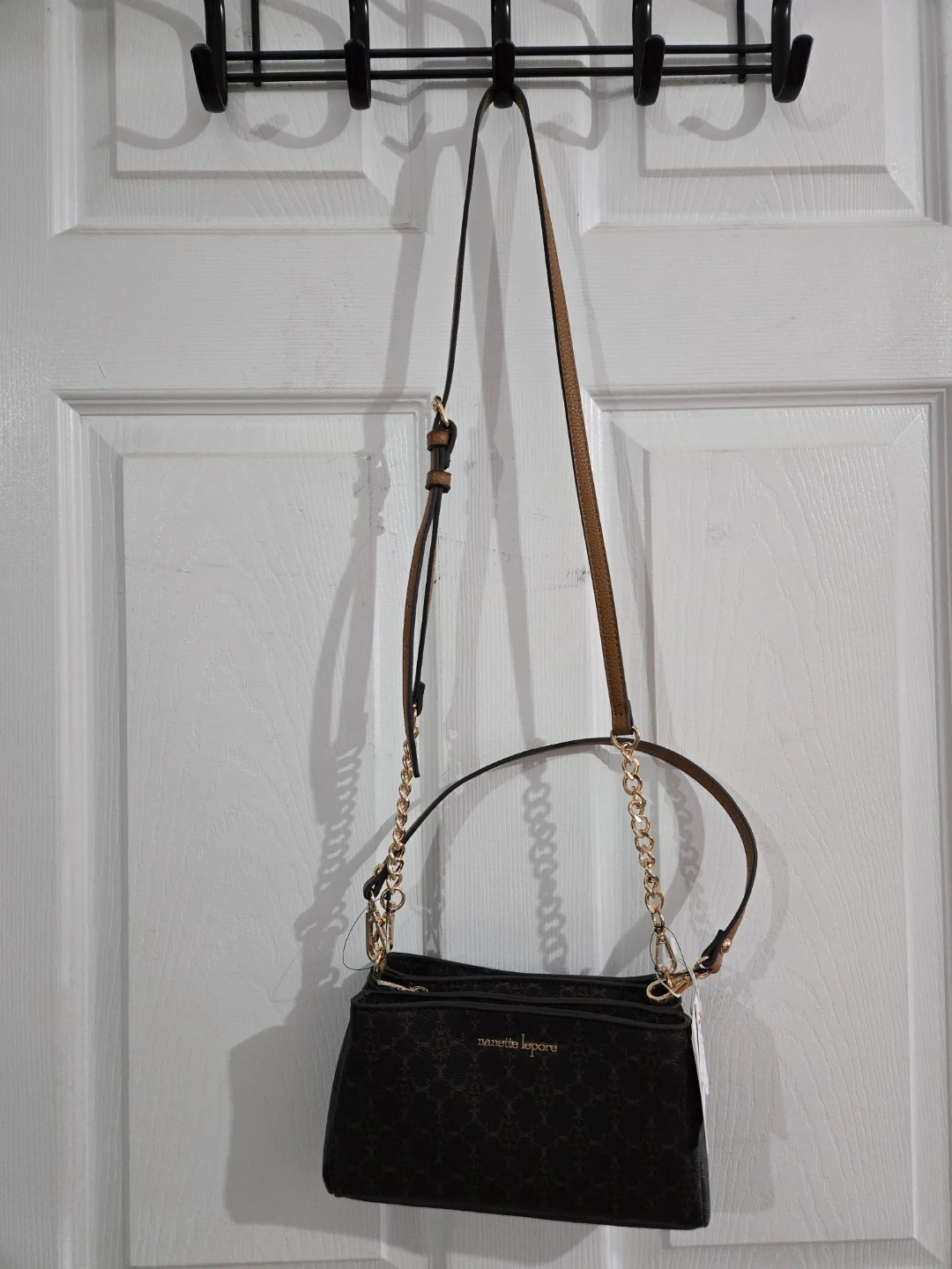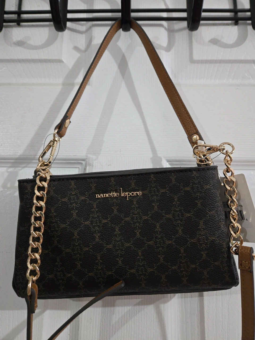 This is a stylish Nanette Lepore satchel purse. It has a dark brown colour with a signature monogram pattern. Comes with both a crossbody strap and a shorter chain handle.