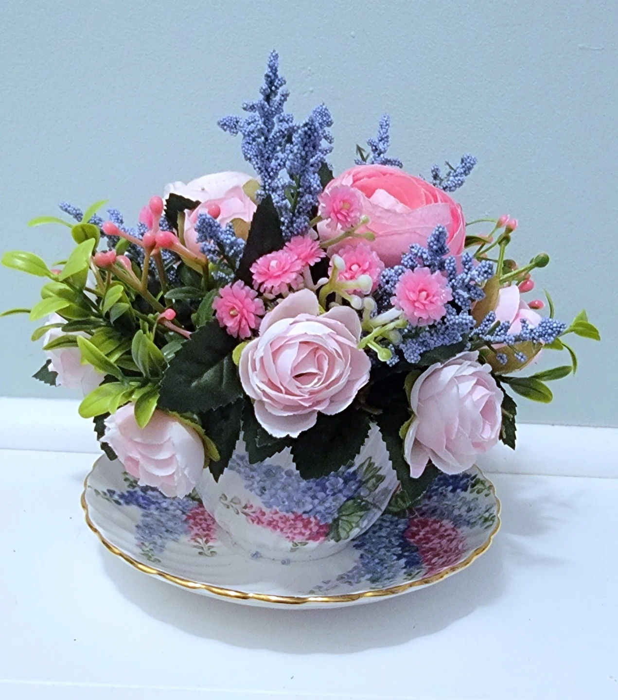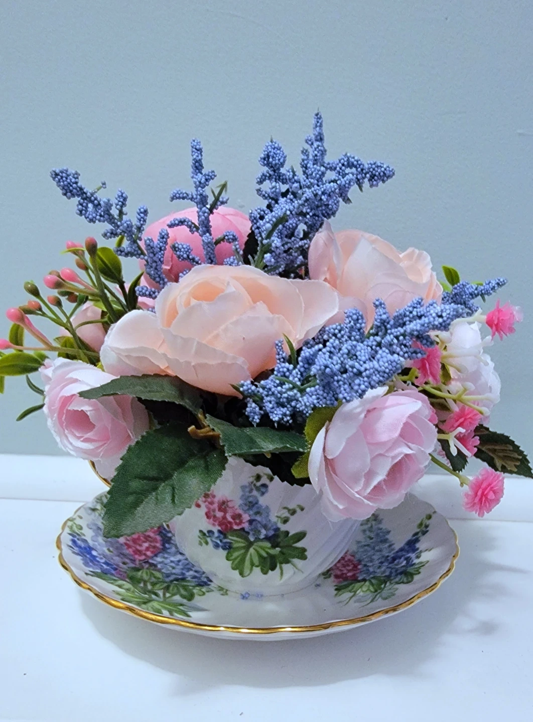 Charming artificial flower arrangement nestled in a decorative teacup and saucer. Features pink roses, blue sprigs, and green foliage. This quaint piece adds a lovely touch to any shelf or table.