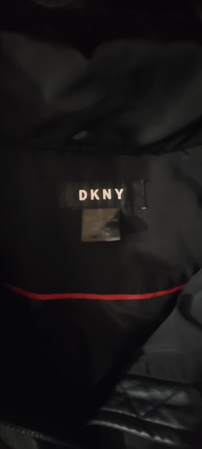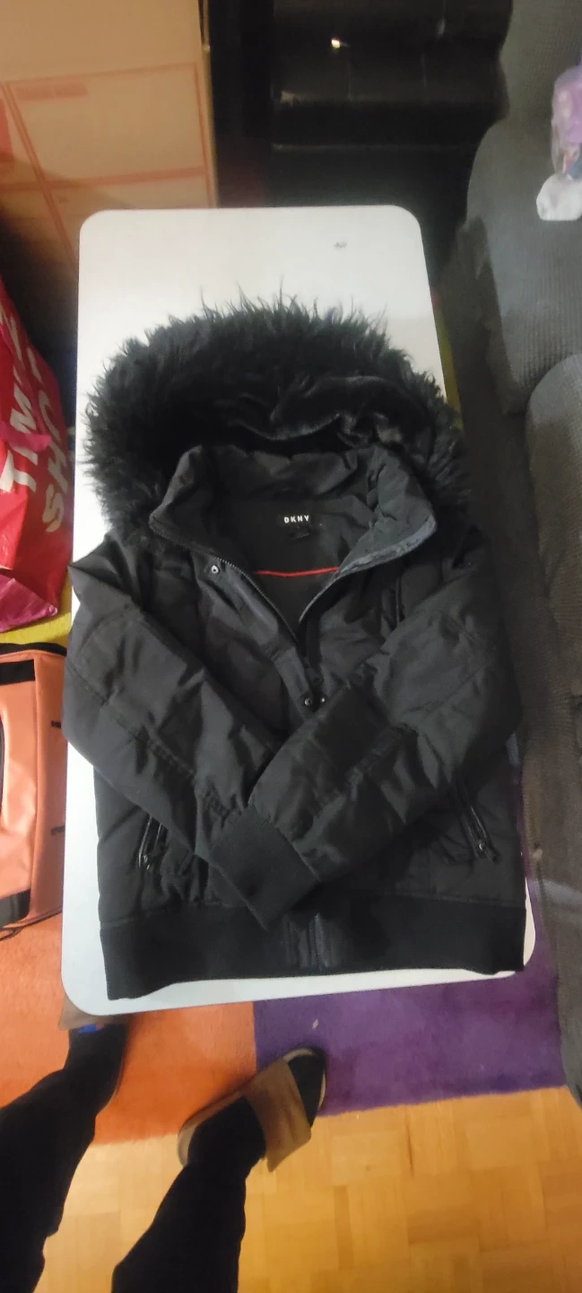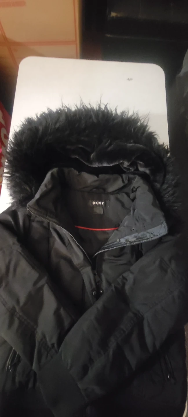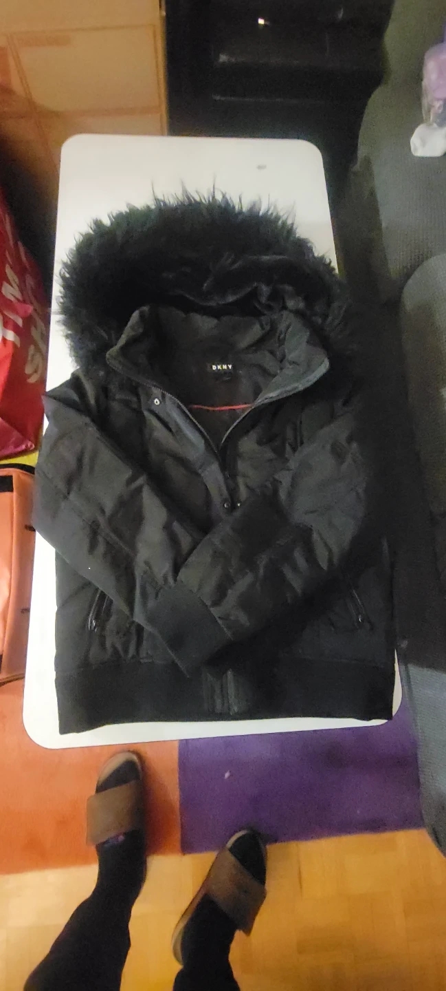 DKNY black puffer jacket with a removable faux fur trimmed hood. It's a stylish and warm winter coat. Zipper closure with snap button placket.