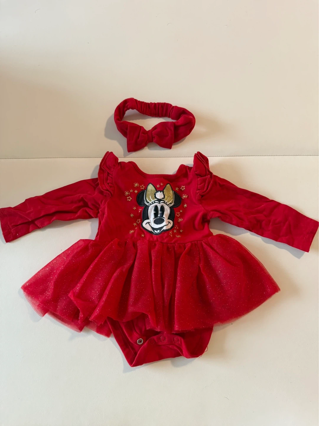 Adorable red long-sleeved Minnie Mouse bodysuit with a glittery tutu skirt and matching headband. It features an embroidered Minnie Mouse face with stars. Snaps at the bottom for easy changes.