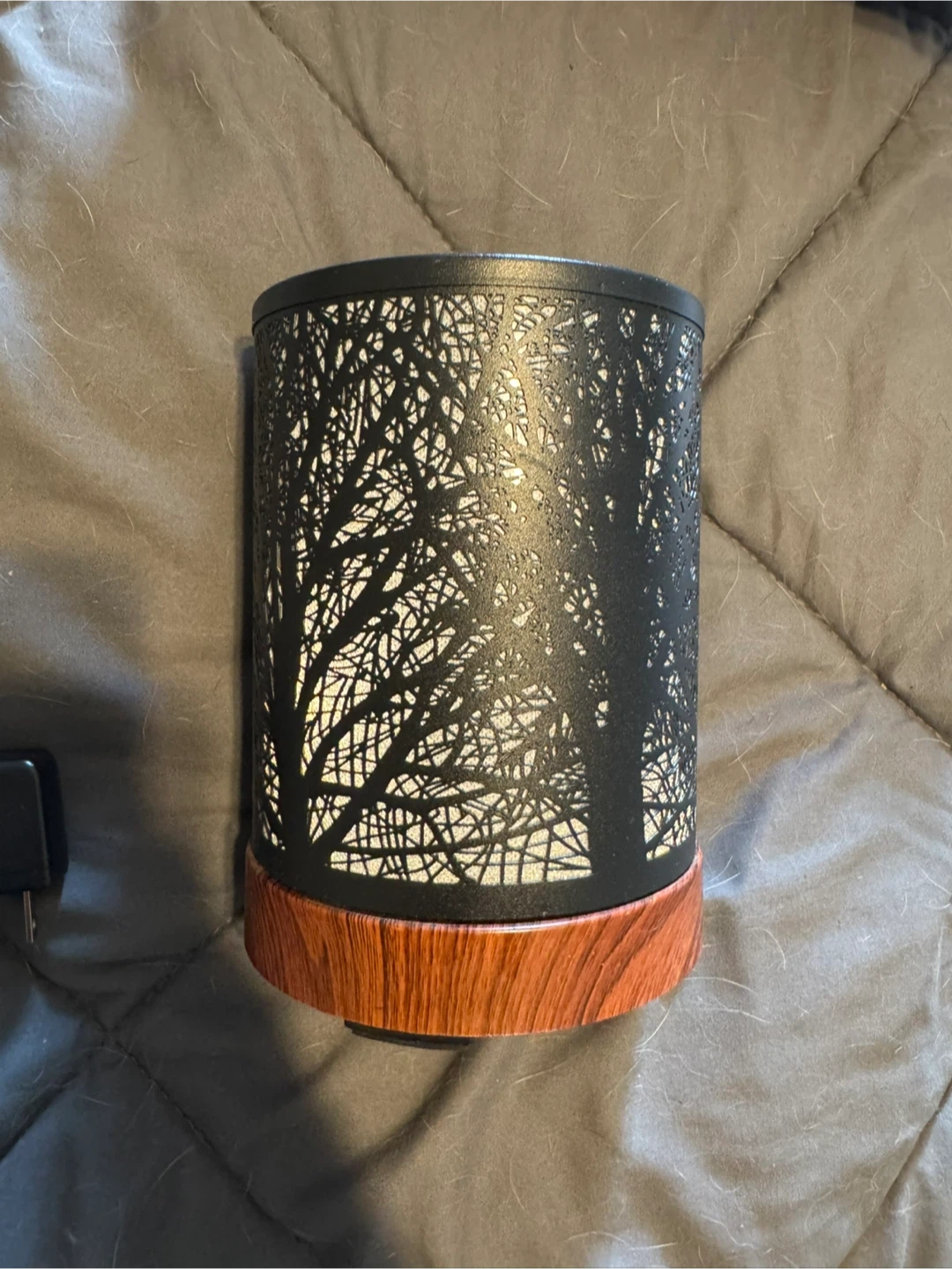 This aroma diffuser features a black metal shade with an intricate tree silhouette design. It has a faux wood base and a power cord is included. It's perfect for adding a cozy ambiance and pleasant scents to any room.