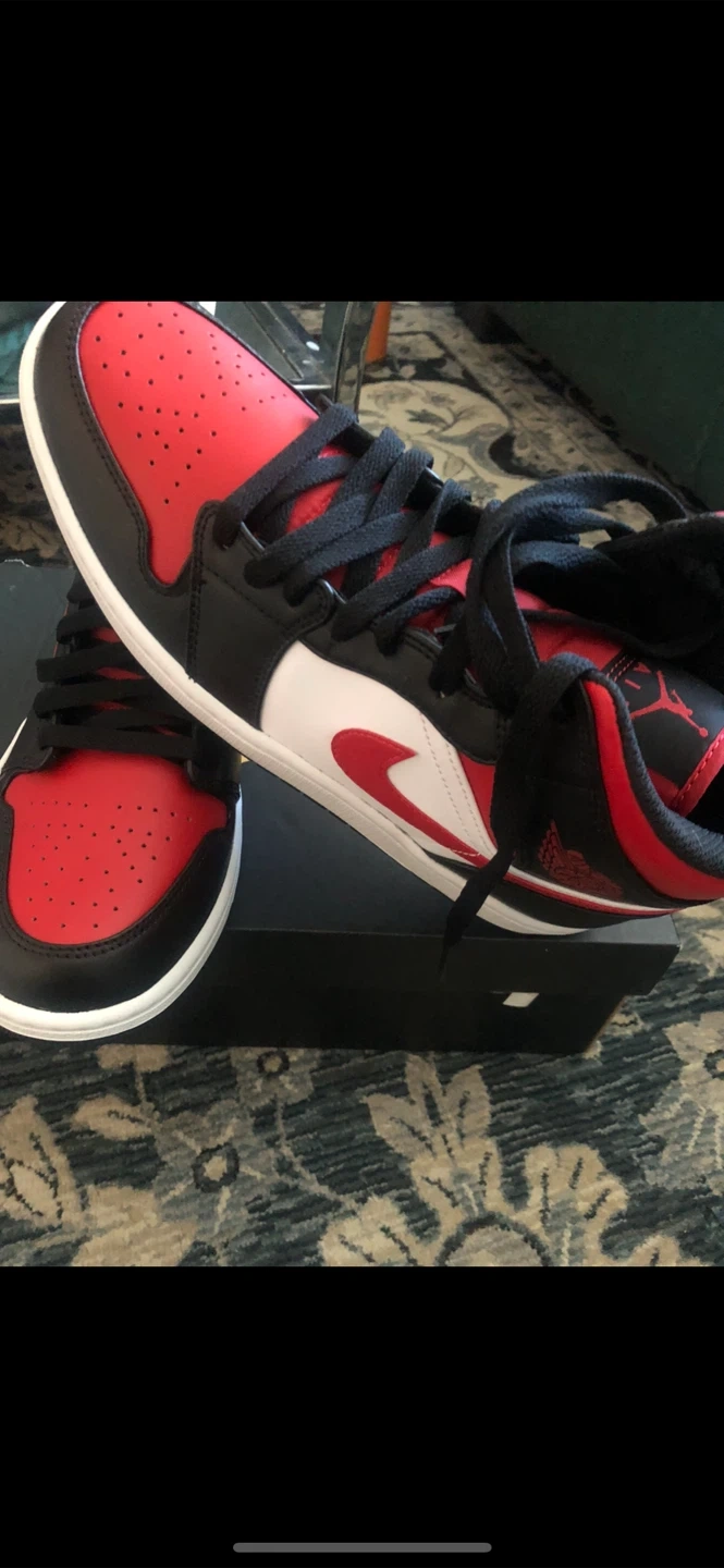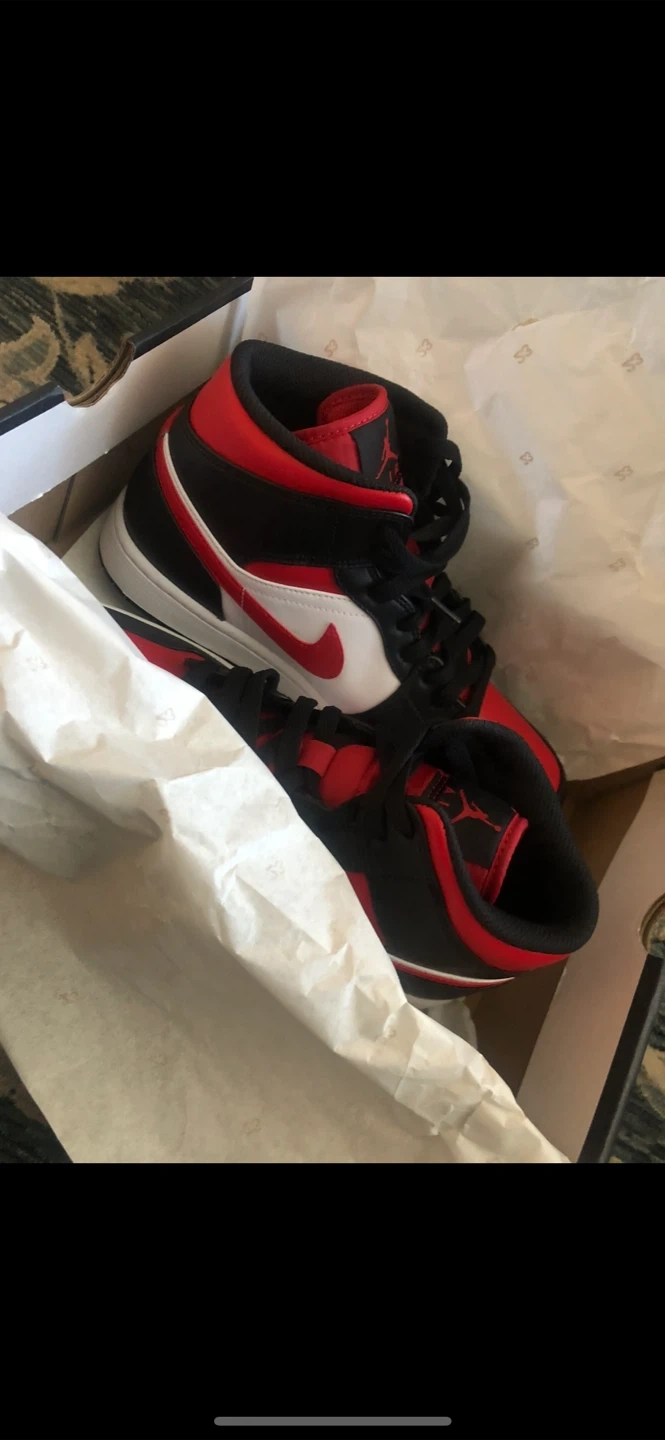 Men's mid-top sneakers in black, red, and white colourway. Lace-up closure with rubber soles. Comes with original box.
