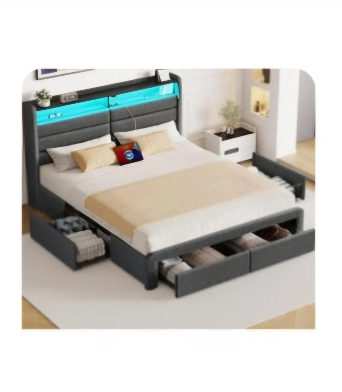Grey upholstered bed frame with built-in storage drawers. It features integrated LED lighting in the headboard for a modern look. This bed frame has multiple drawers for convenient storage needs.