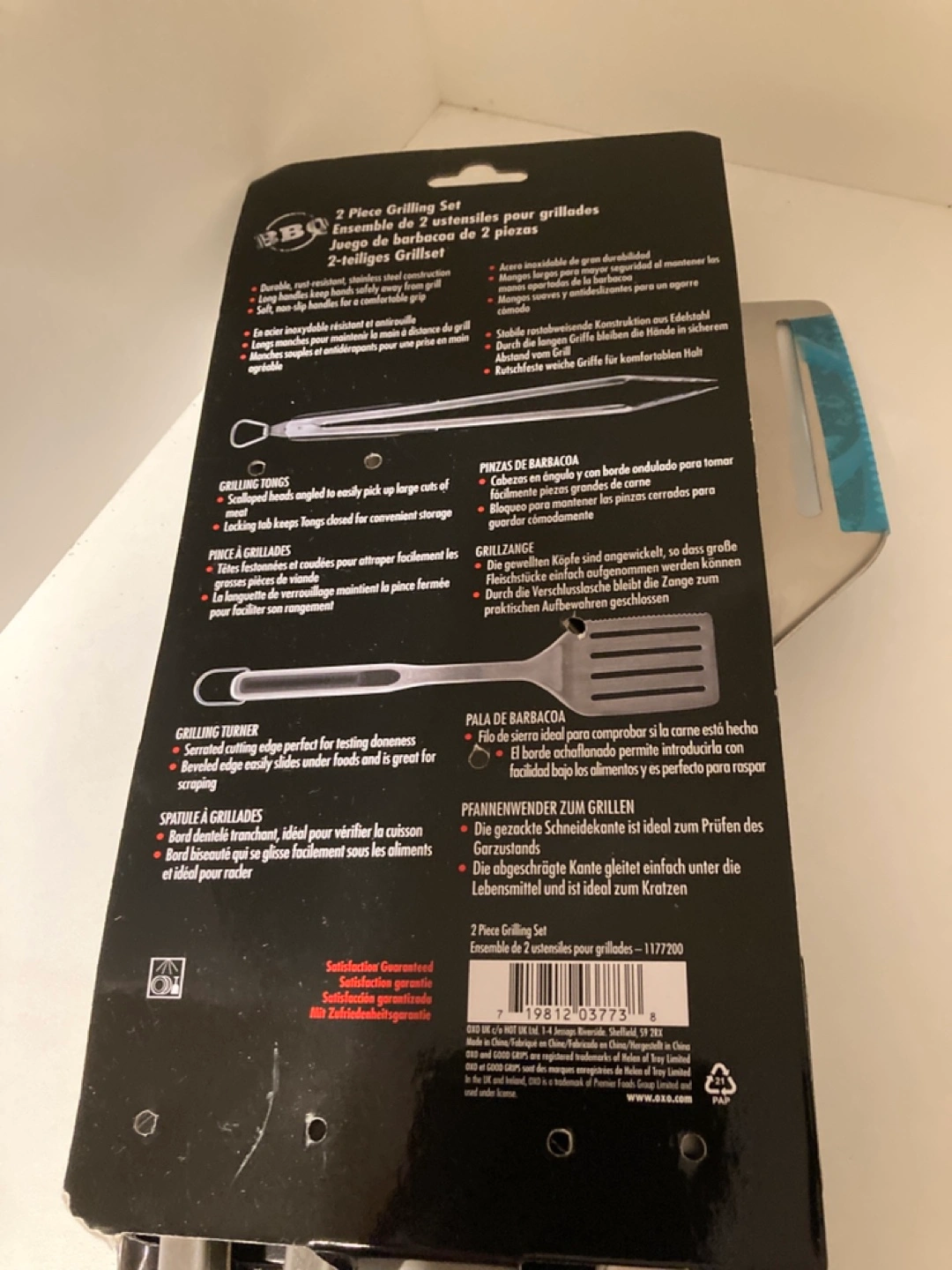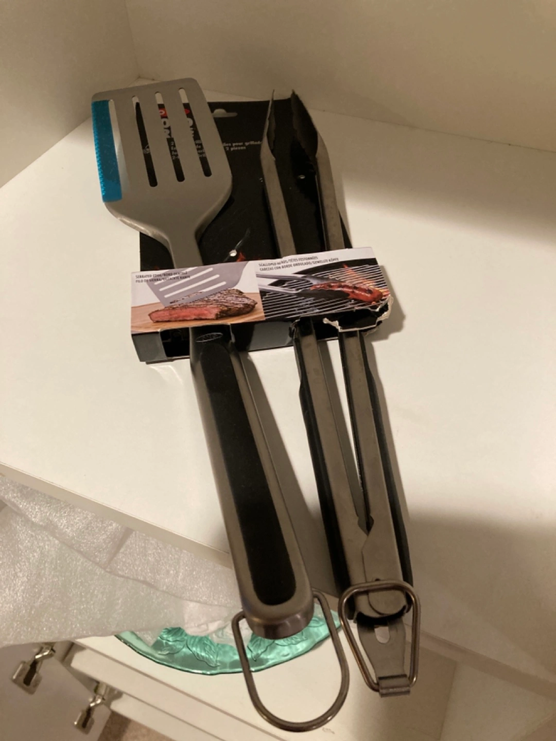 New, in package. Includes spatula and tongs. Stainless steel construction. Ergonomic handles. Perfect for barbecuing.