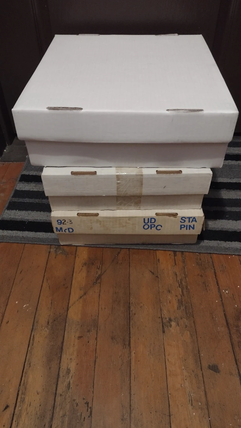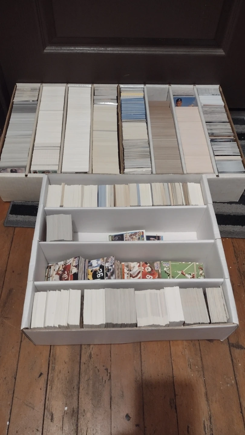A large collection of sports trading cards stored in multiple boxes. Includes various years and types of cards. These cards are great for collectors or for anyone looking to start a collection. $25 each box now 4 boxes