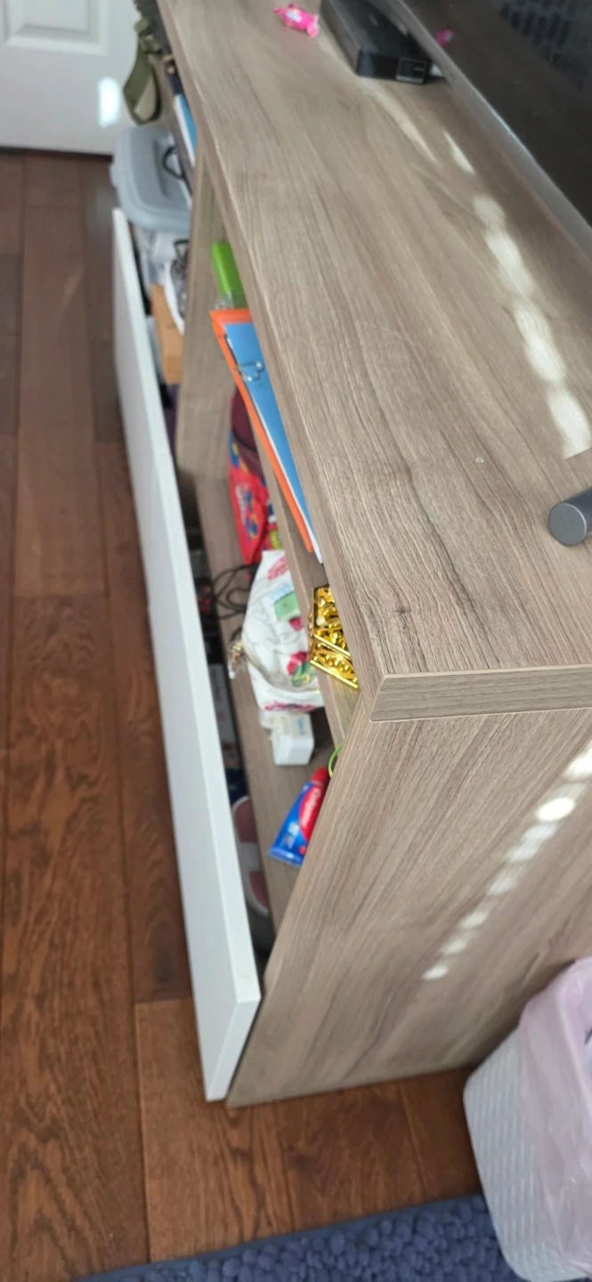 Selling a TV stand. It has a wood-look top and white doors. Working condition drawers. Small scratch that hides behind the TV once mounted.