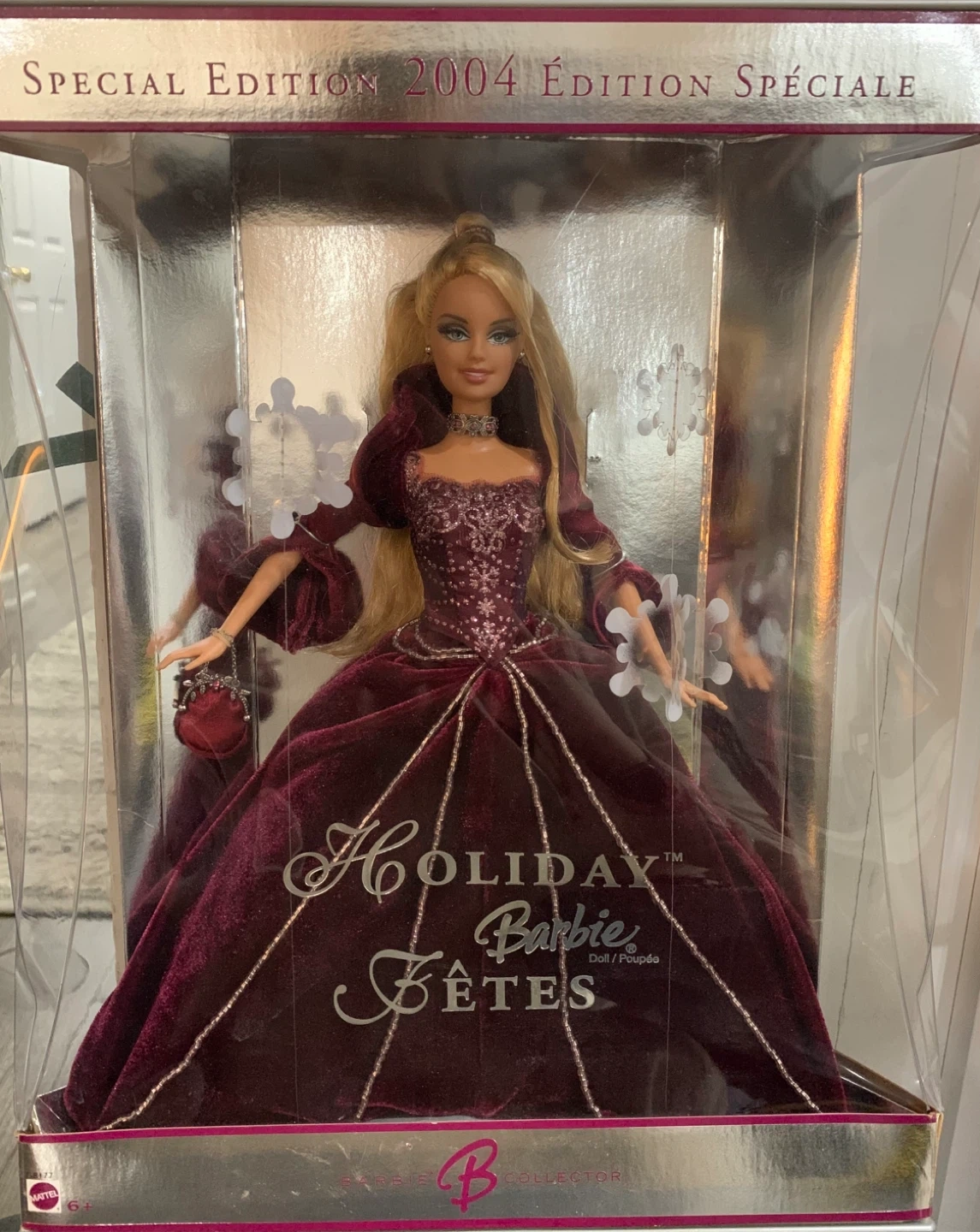 Special Edition 2004 Holiday Barbie Fêtes collector doll. It's a beautiful Barbie dressed in a burgundy gown. This doll is from the collector series.