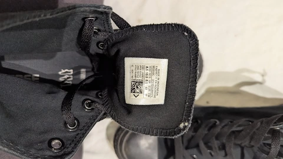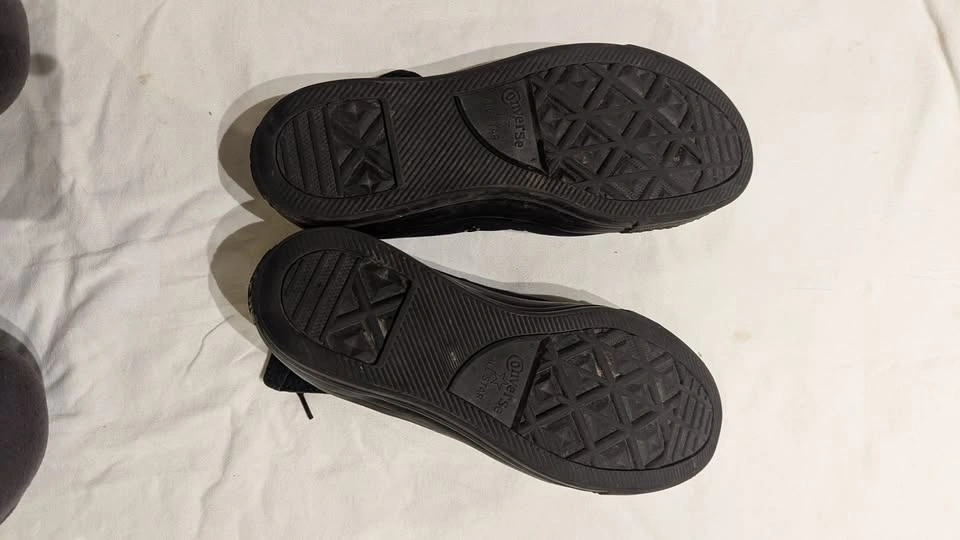 Men's size 8.5, black Converse Chuck Taylor All-Stars. Features a canvas upper and lining, classic white rubber toe cap, lace-up front, and a cushioned insole. The vulcanized rubber outsole provides traction and flexibility. Original Chuck Taylor logo patch. Pick up in Kitchener or Brampton.
