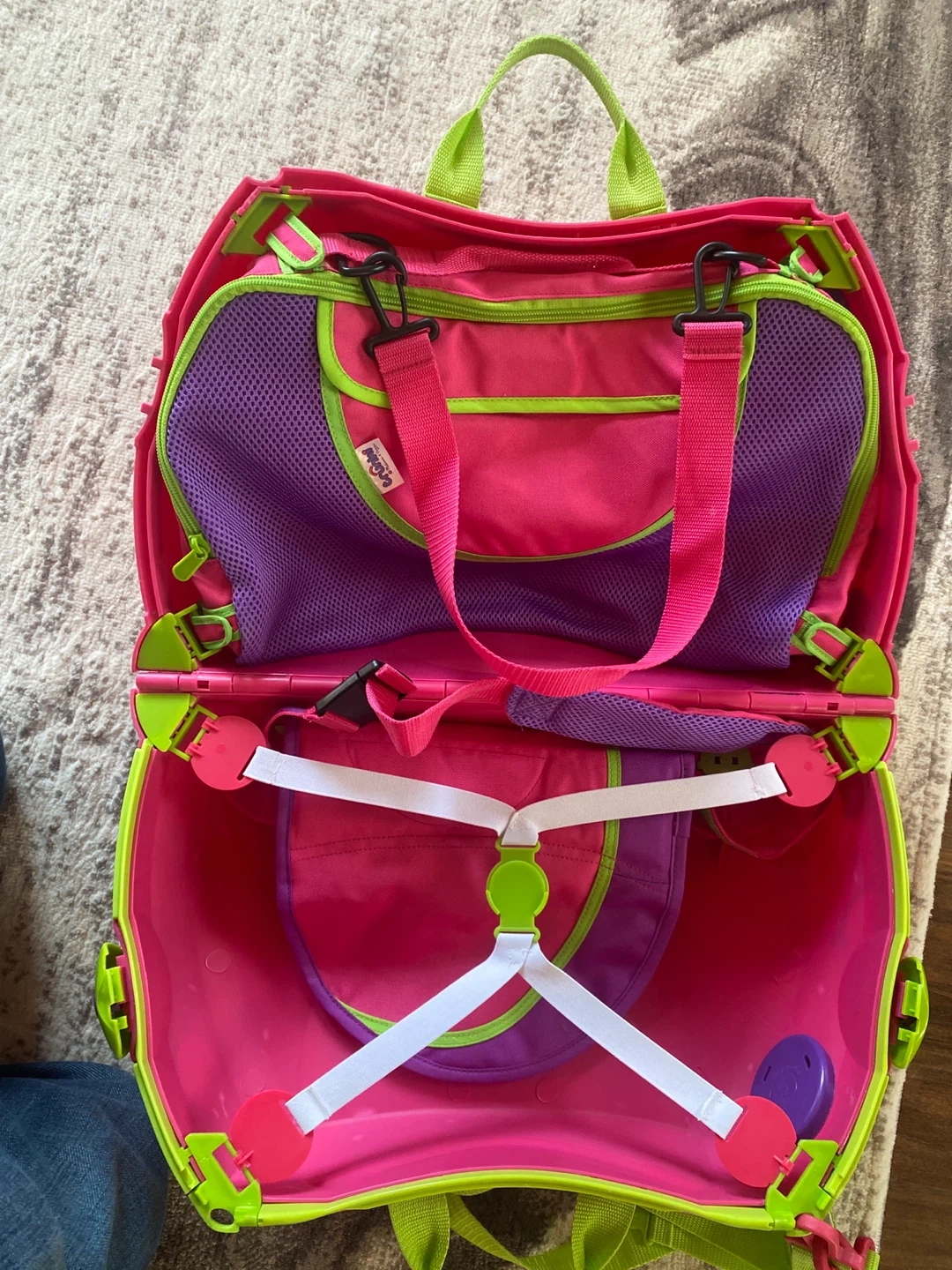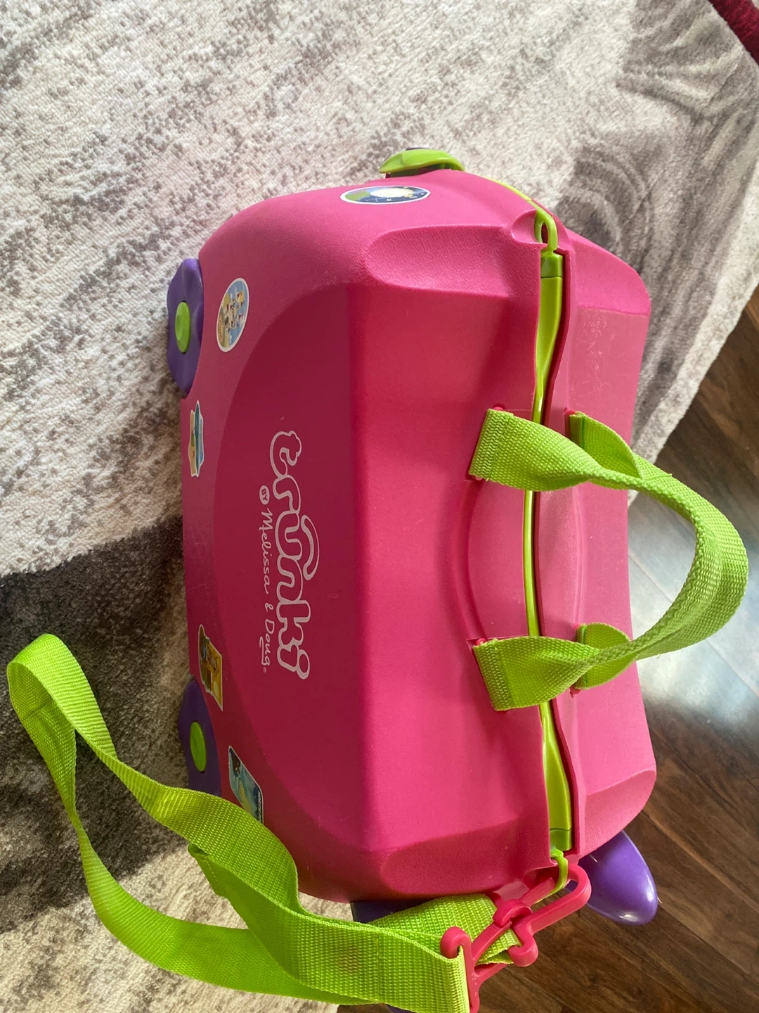 This Trunki ride-on suitcase is perfect for little travellers! It features a durable pink design with fun stickers. It's made for kids to sit on and ride or pull along.