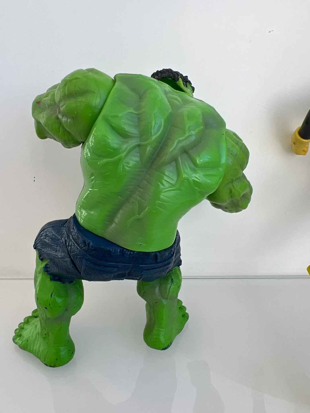 Includes a Hulk action figure with dark blue shorts and a Cyclops action figure from the X-Men. These figures are made of plastic.