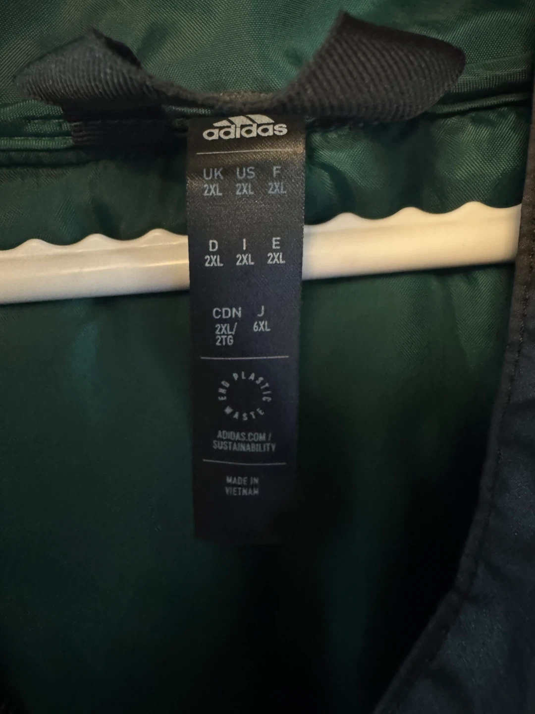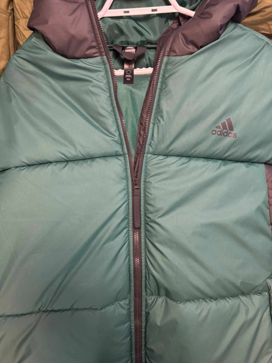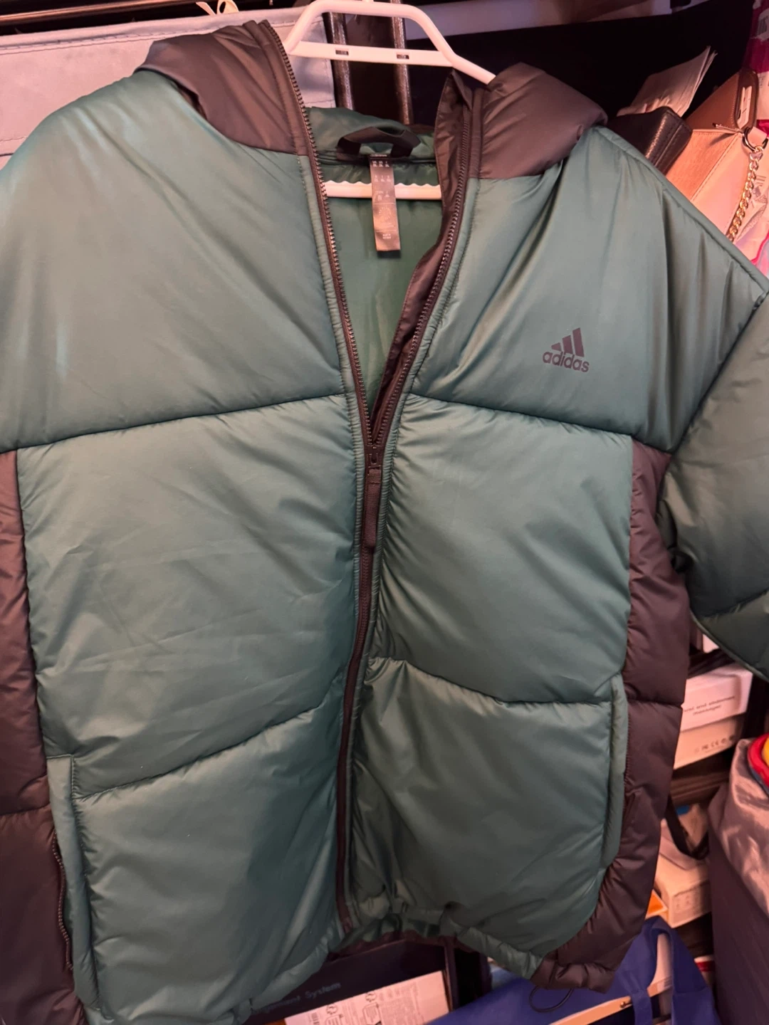 This is an Adidas puffer jacket in a green and grey colourway. It's a size 2XL.