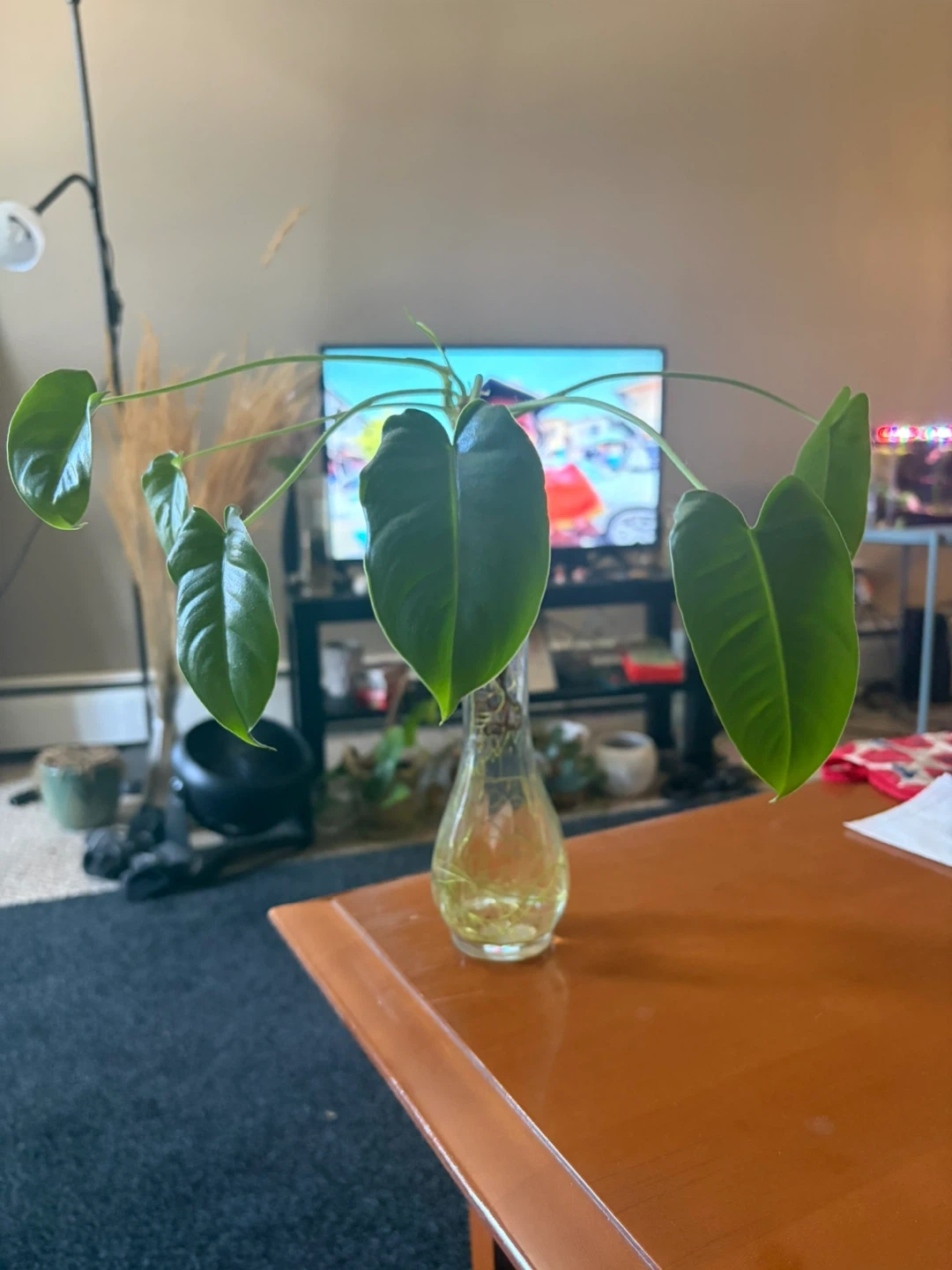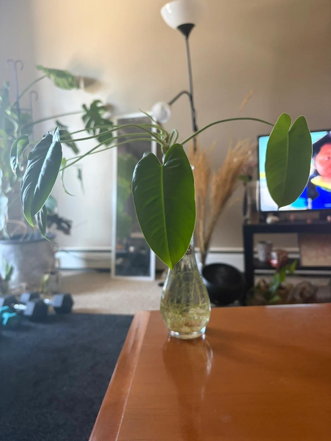 This is a live Philodendron plant cutting rooted in water. It's ready to be planted in soil. It has several healthy leaves and is growing new ones. This plant is great for starting your indoor jungle or adding greenery to your space!