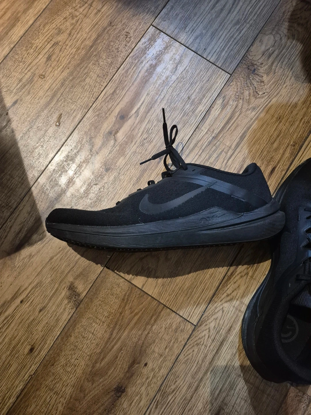 These are black Nike running shoes. They're designed for comfort and performance. Good for workouts or everyday wear!