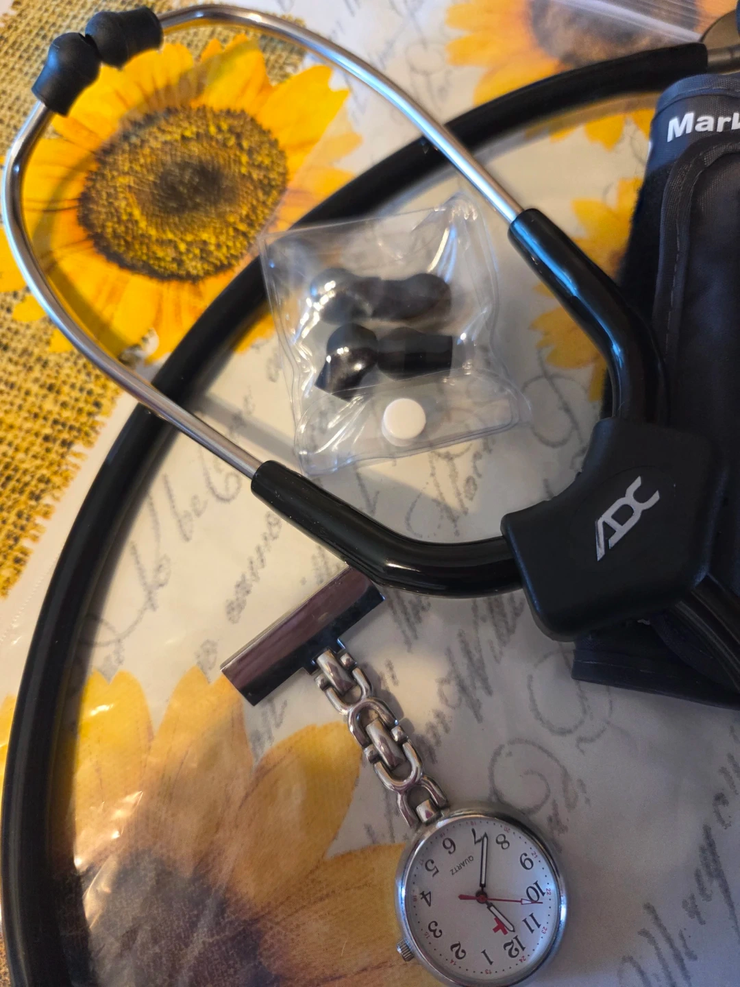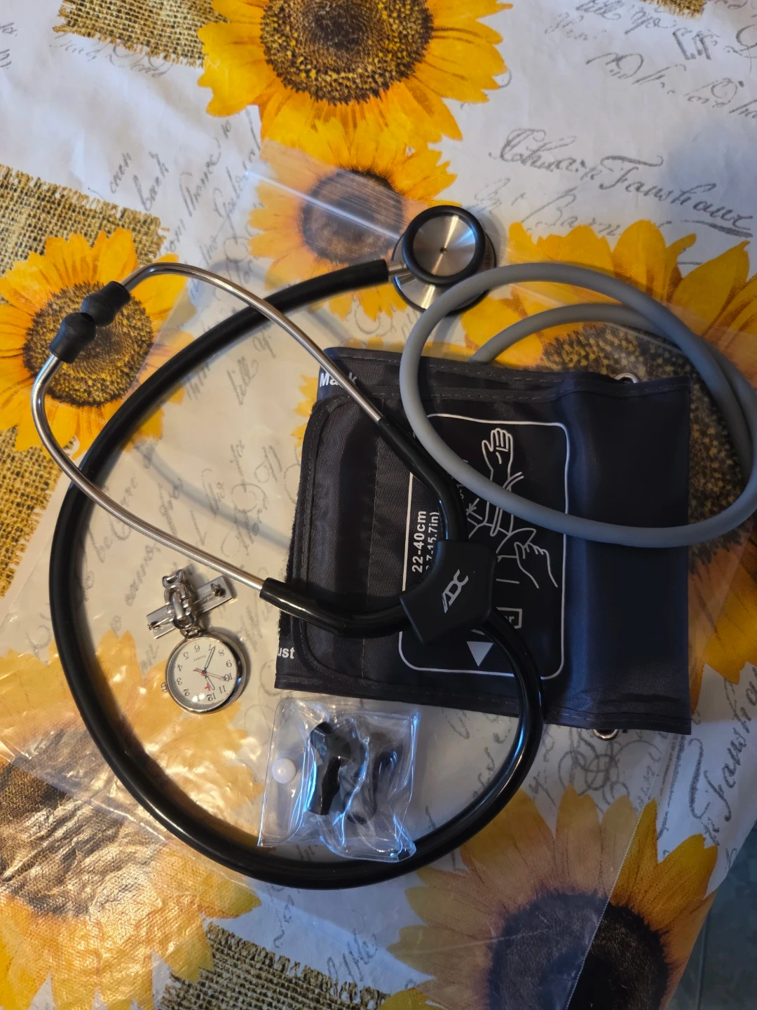 This is a black ADC stethoscope and a blood pressure cuff with a pin-on watch.