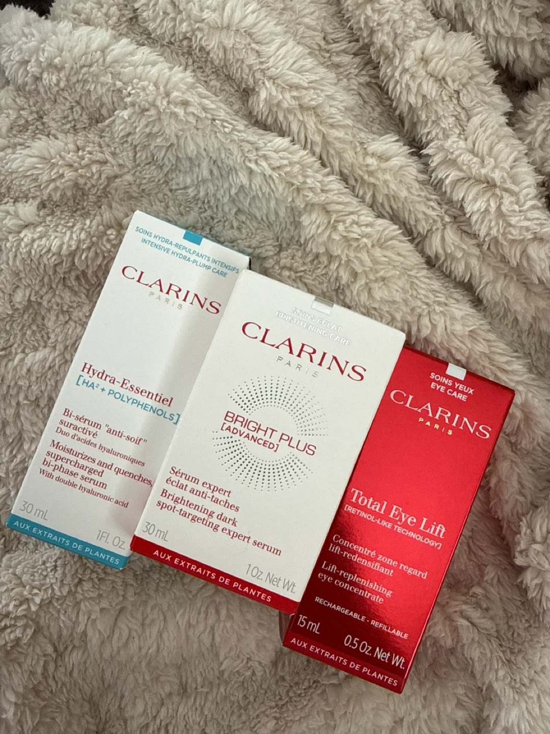 This set includes Clarins Hydra-Essentiel bi-phase serum (30mL) for intense hydration, Bright Plus Advanced serum (30mL) for brightening dark spots, and Total Eye Lift eye concentrate (15mL). All are formulated with plant extracts.