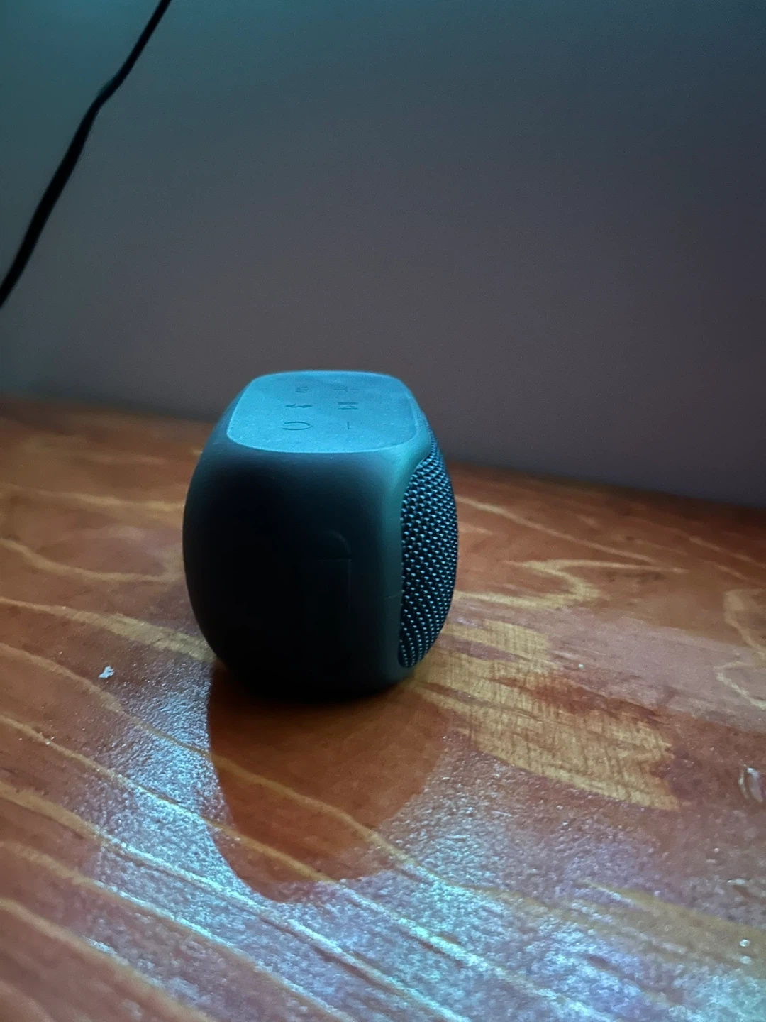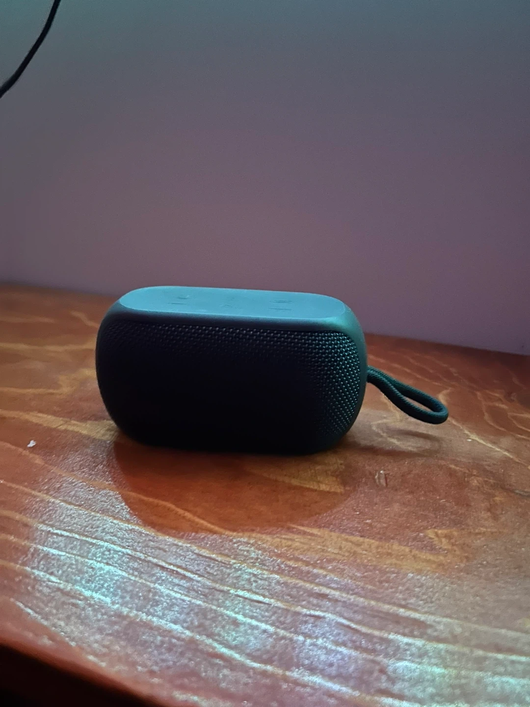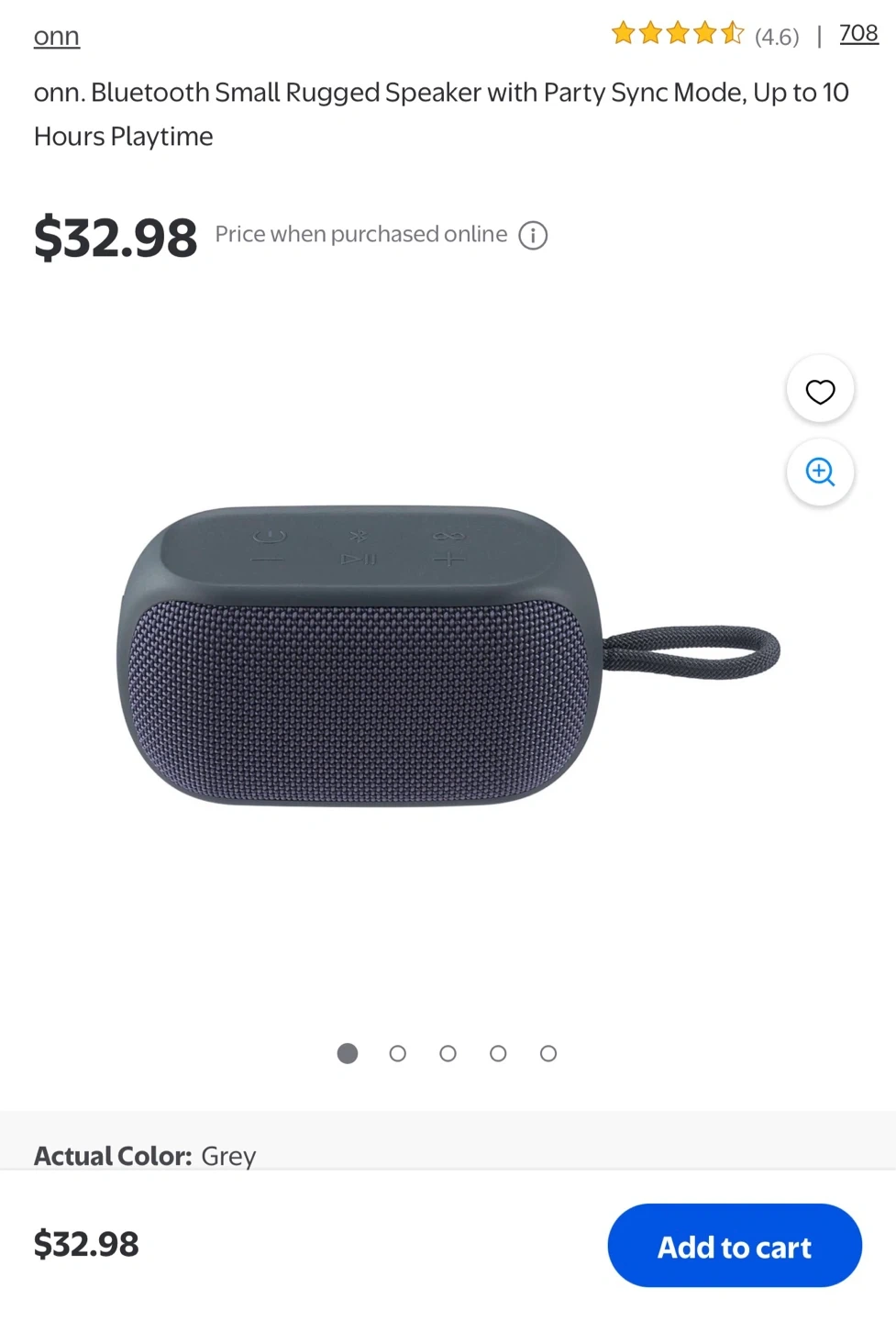 This is an onn. Bluetooth small rugged speaker. It's dark grey and comes with a fabric loop for portability. Up to 10 hours playtime.