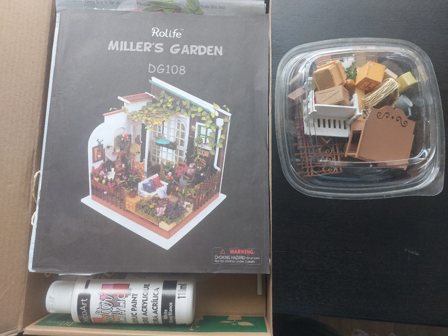 This is the Rolife DIY Mini House - Miller's Garden model kit. It comes with all the pieces and paint needed to build a detailed miniature garden scene. It's a fun and engaging craft project!