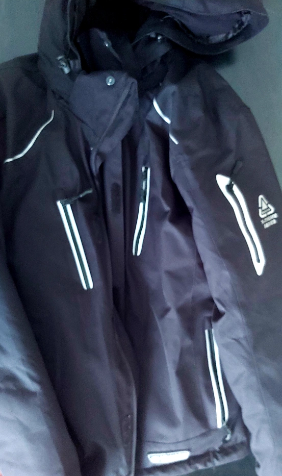 Men's black jacket. Features a hood, multiple zippered pockets, and white accents. Waterproof and windproof.