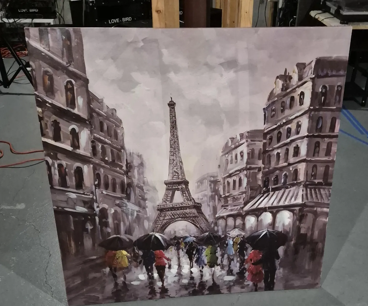 Canvas print depicting the Eiffel Tower in Paris on a rainy day with people carrying umbrellas. This art piece adds a touch of European charm to any room. Great for adding a bit of ambiance!