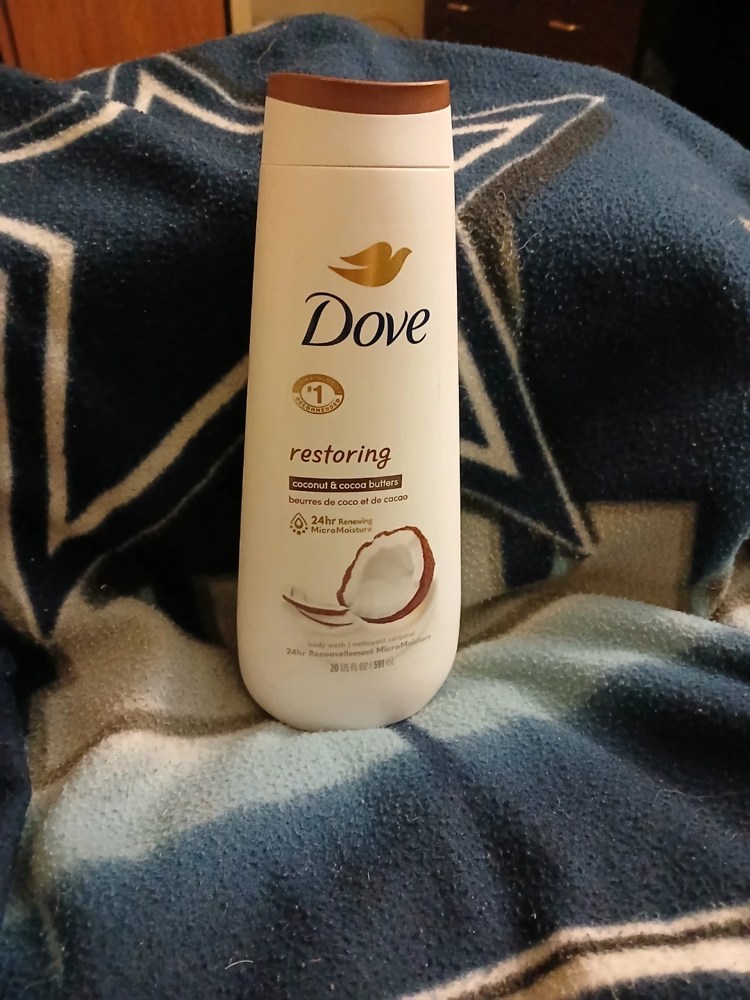 Selling a bottle of Dove Restoring body wash. It's the coconut and cocoa butter scent, which smells amazing! It has 24hr renewing MicroMoisture and comes in a 20 US fl oz (591 ml) bottle