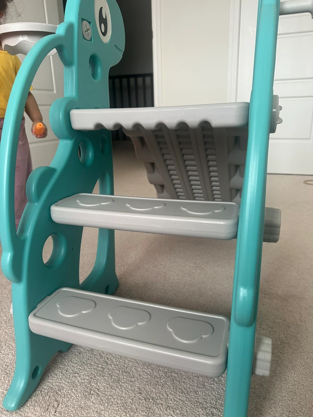 This teal and grey children's slide and climber set is perfect for little ones to enjoy indoor or outdoor fun. It's designed with safety in mind, featuring easy-to-climb steps and a gentle slide. The durable plastic construction ensures it can withstand hours of play. This item is suitable for toddlers and young children.
