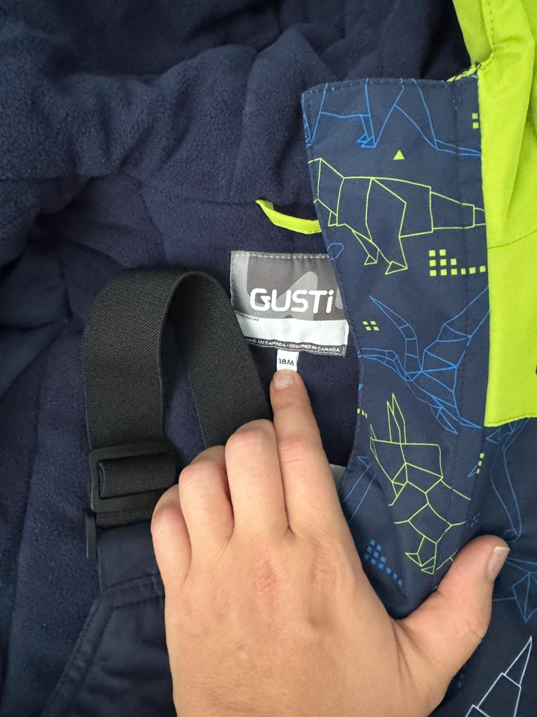 This is a brand new Gusti snowsuit, perfect for keeping your little one warm and dry during the winter months! It's a size 18M and features a vibrant green and navy blue colour scheme. The snowsuit is made with 3M Thinsulate insulation for maximum warmth and comfort. It's designed in Canada!