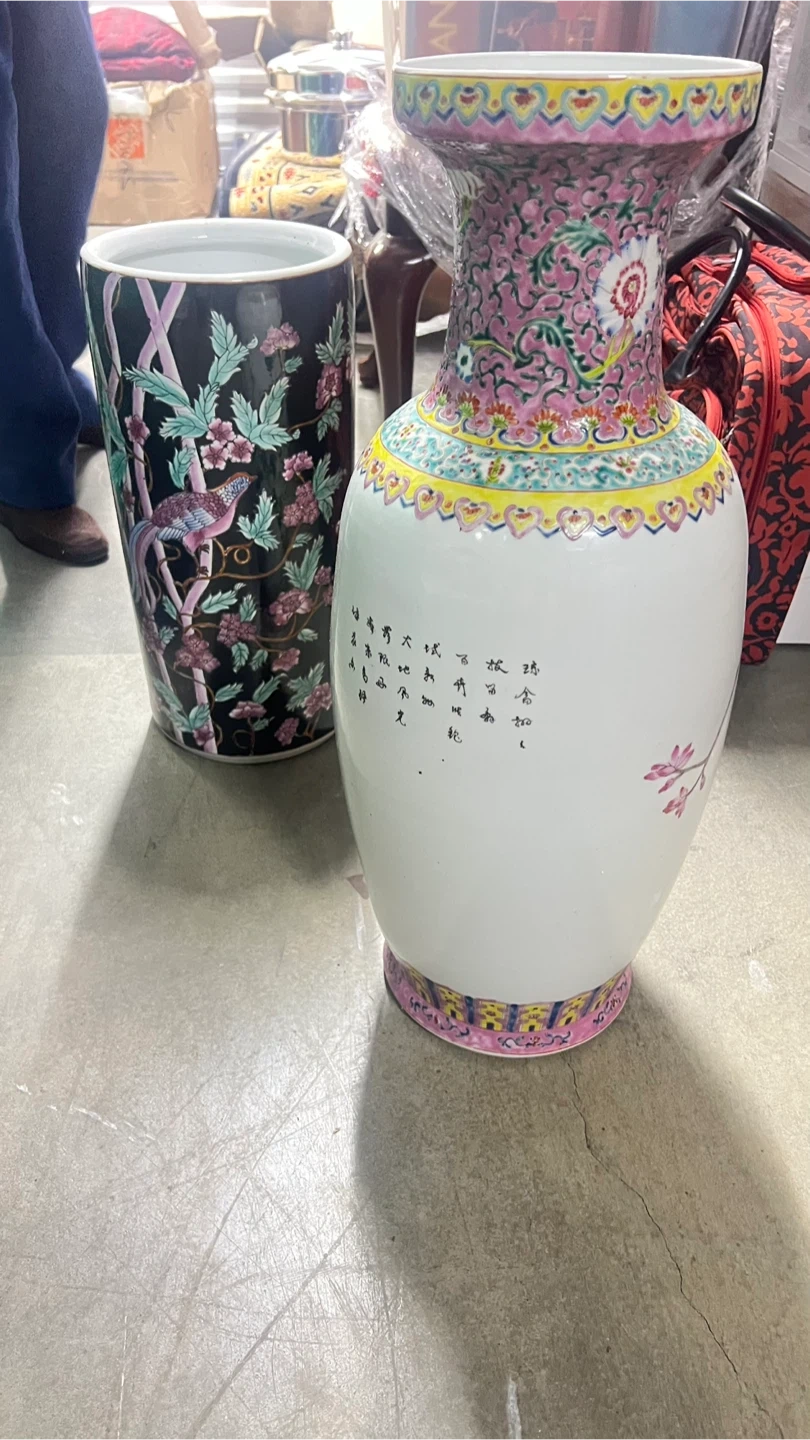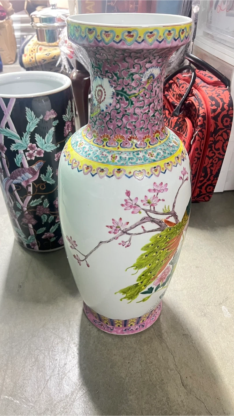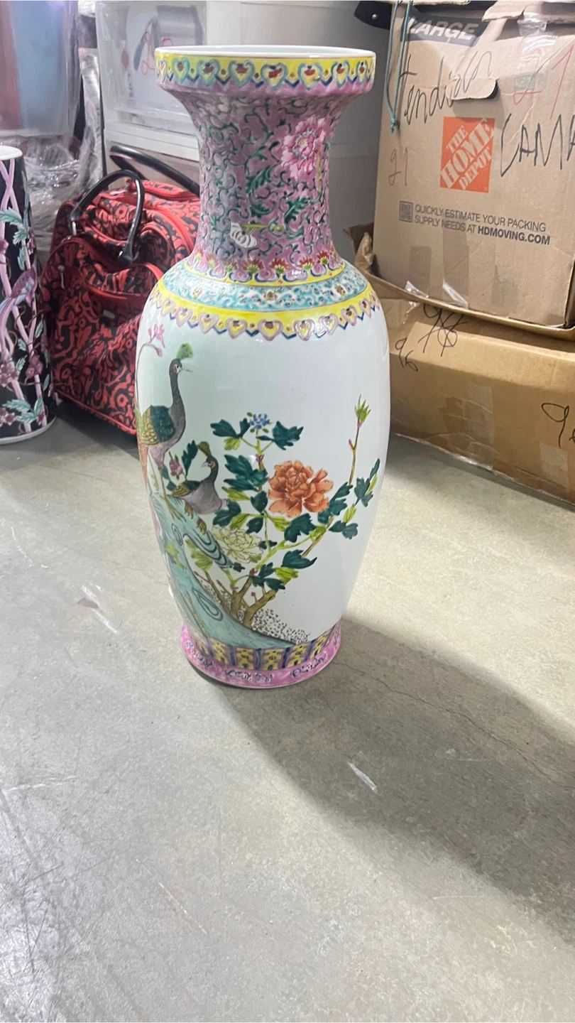 This porcelain vase showcases a beautiful peacock and floral design. It features vibrant colors and intricate patterns along the neck and base. Perfect for adding an elegant touch to any room!