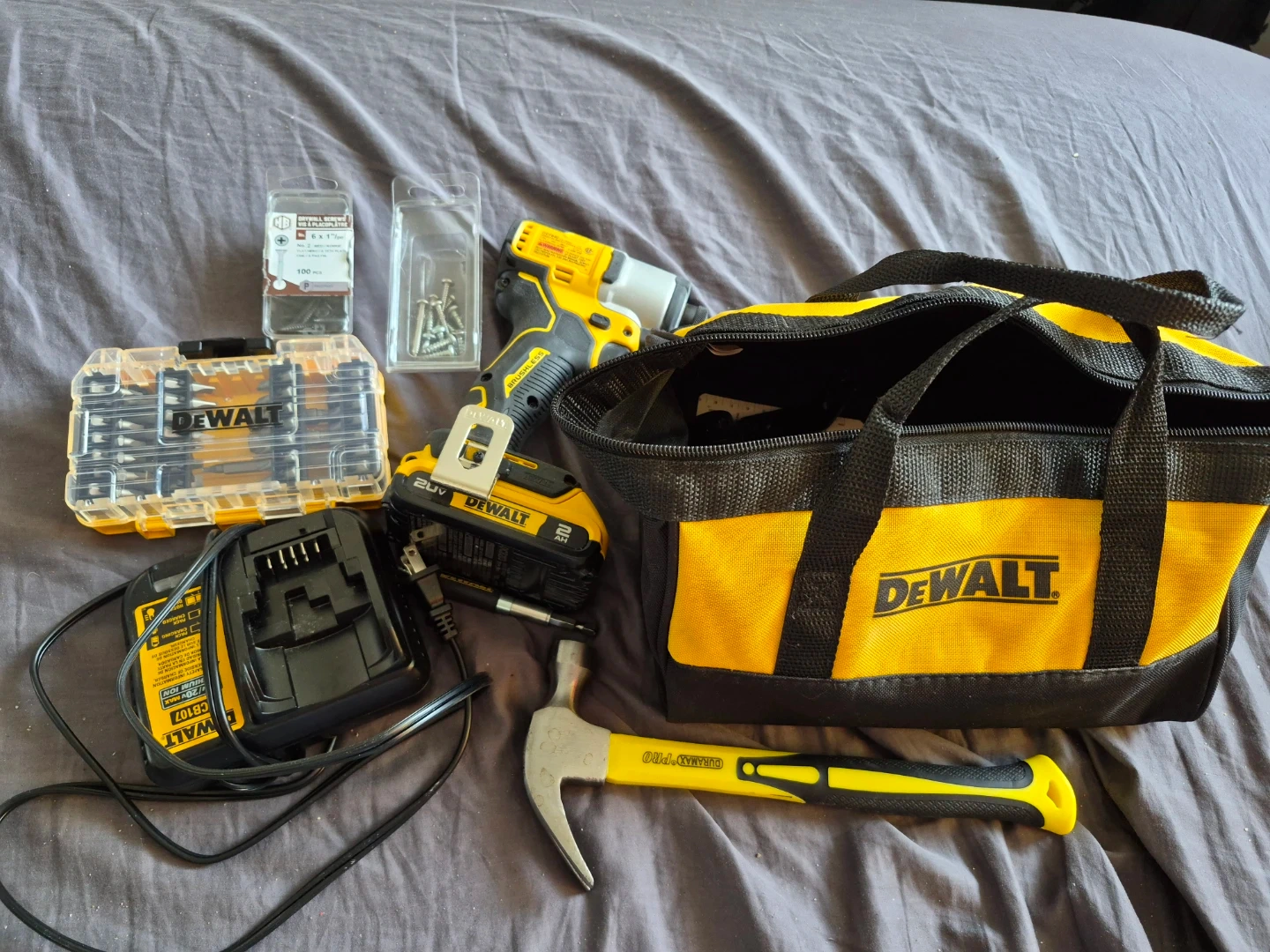 This DeWalt set includes a 20V cordless drill, a 2.0 Ah battery, a charger, a variety of and a DeWalt tool bag. It also comes with a separate package of screws and a hammer.