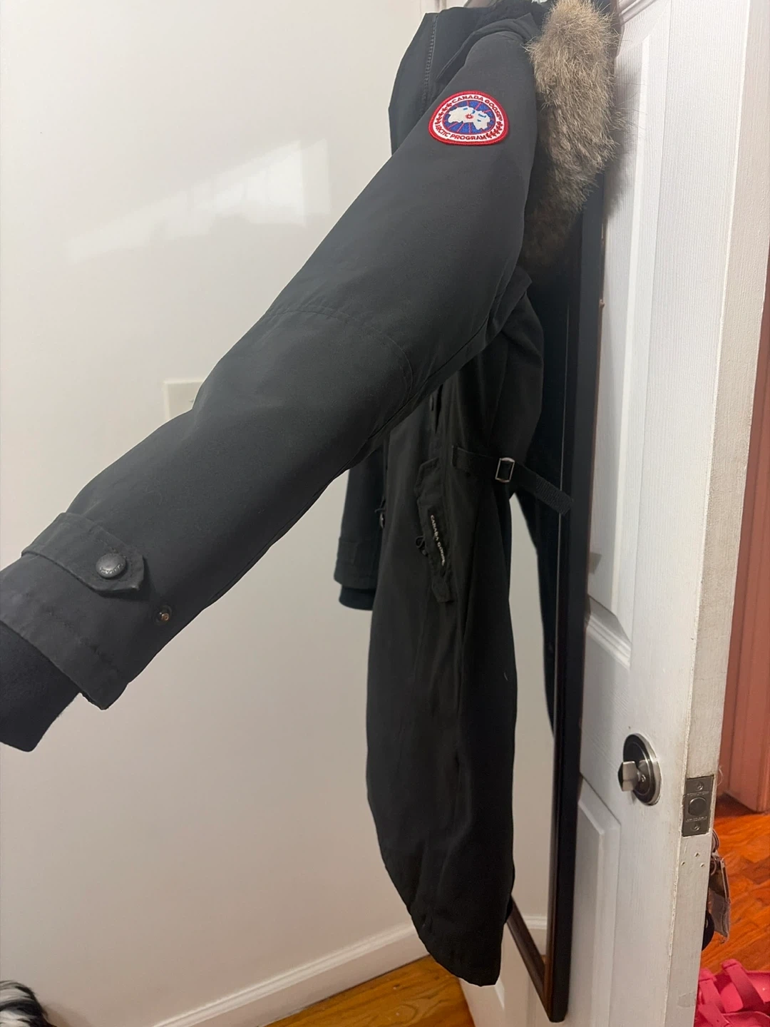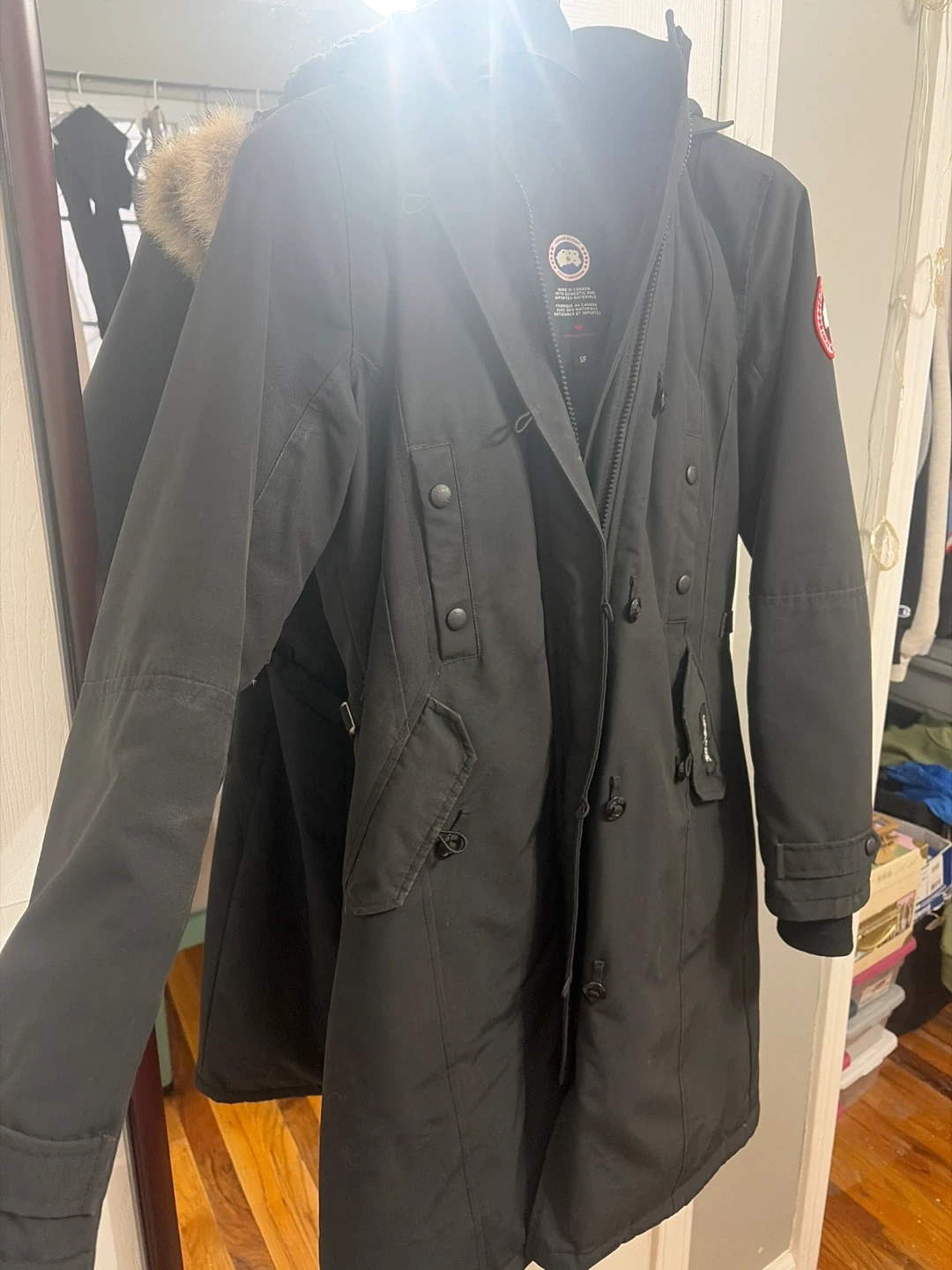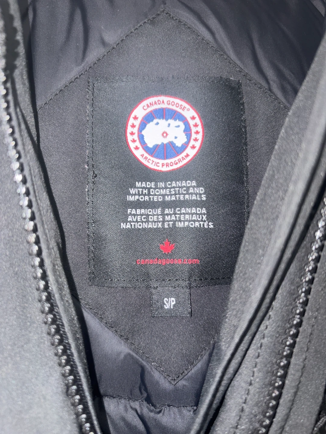 This is a black Canada Goose parka jacket. It's made in Canada with domestic and imported materials. The size is S/P. It features a fur-lined hood.no Canada Goose bag for coat.