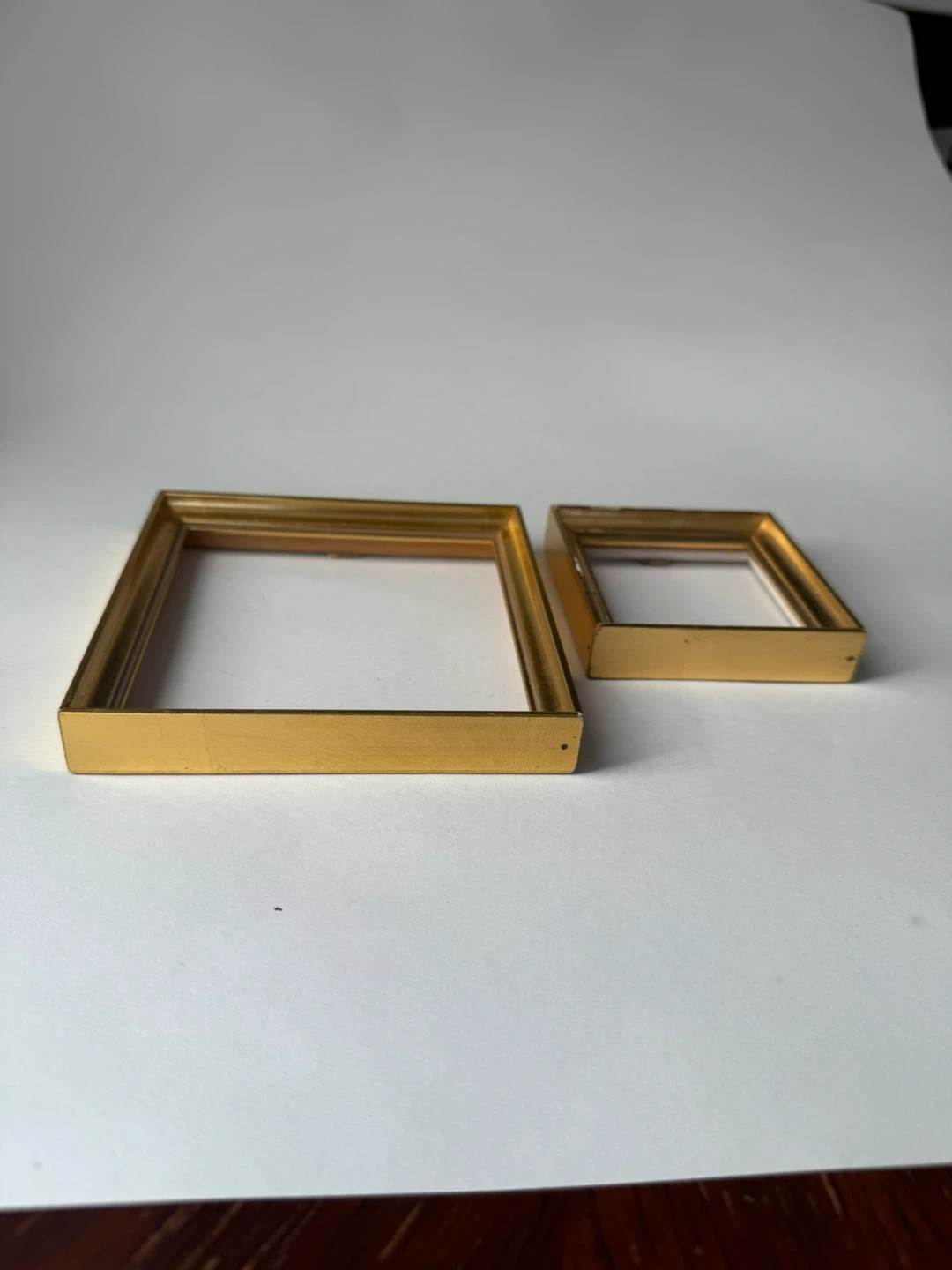 Smaller is 3 ¼” x 3 ¼”, larger is 4 ⅞” x 4 ⅞”