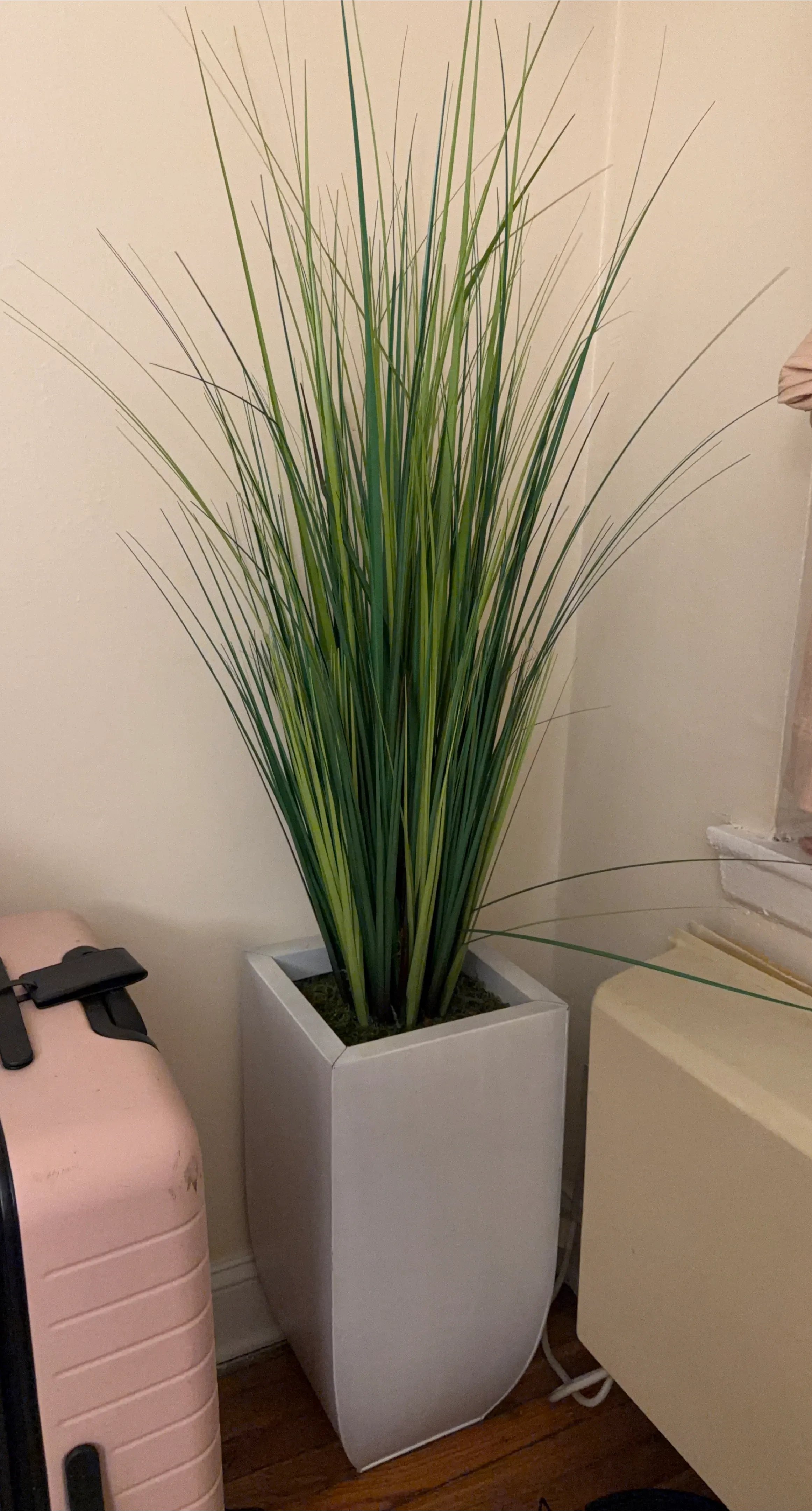 This artificial grass plant has long, slender blades in varying shades of green. It's housed in a clean, modern white planter. It requires no maintenance. Lightweight