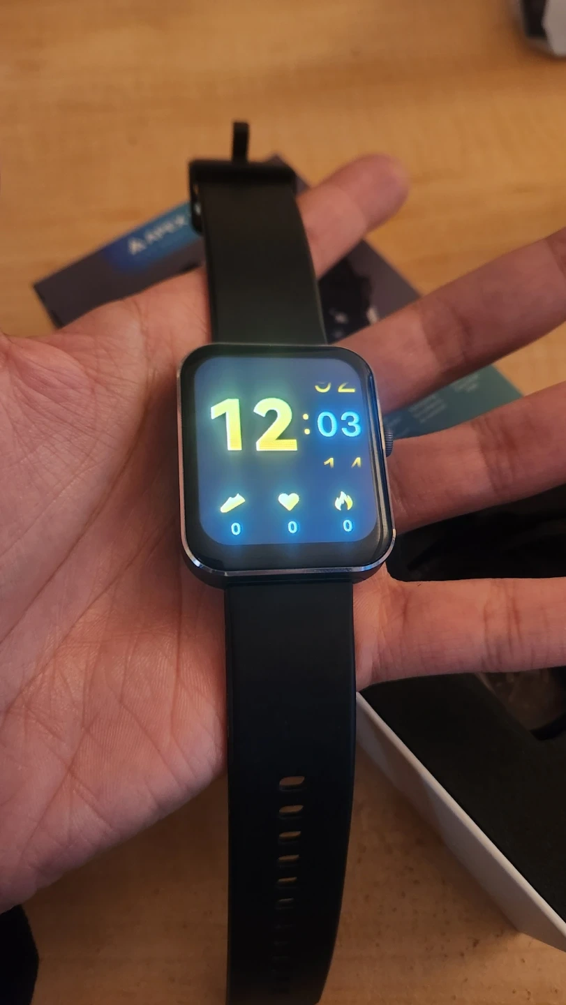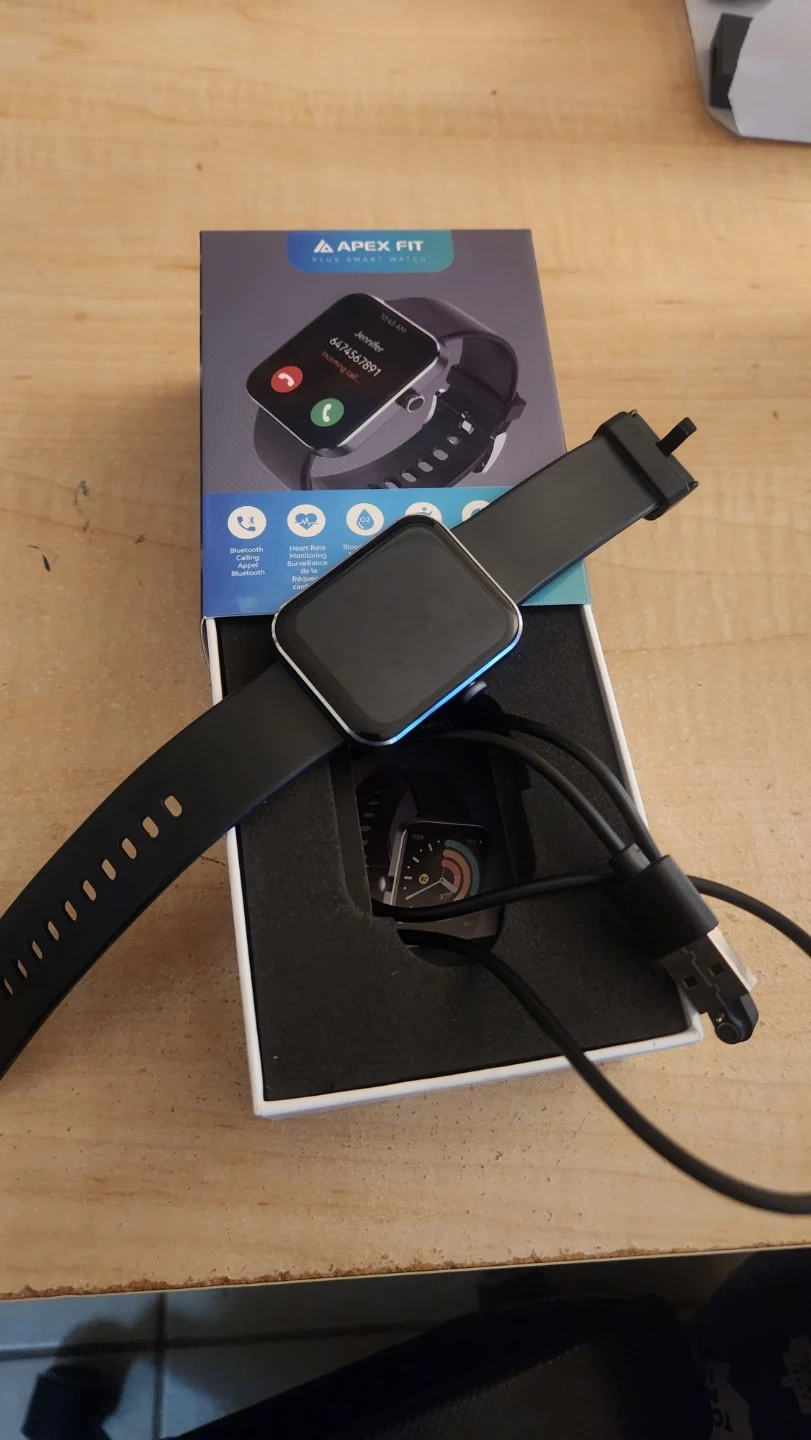 This Apex Fit Plus smart watch supports Bluetooth calls. It's black with a digital display. Includes original box and charging cable.