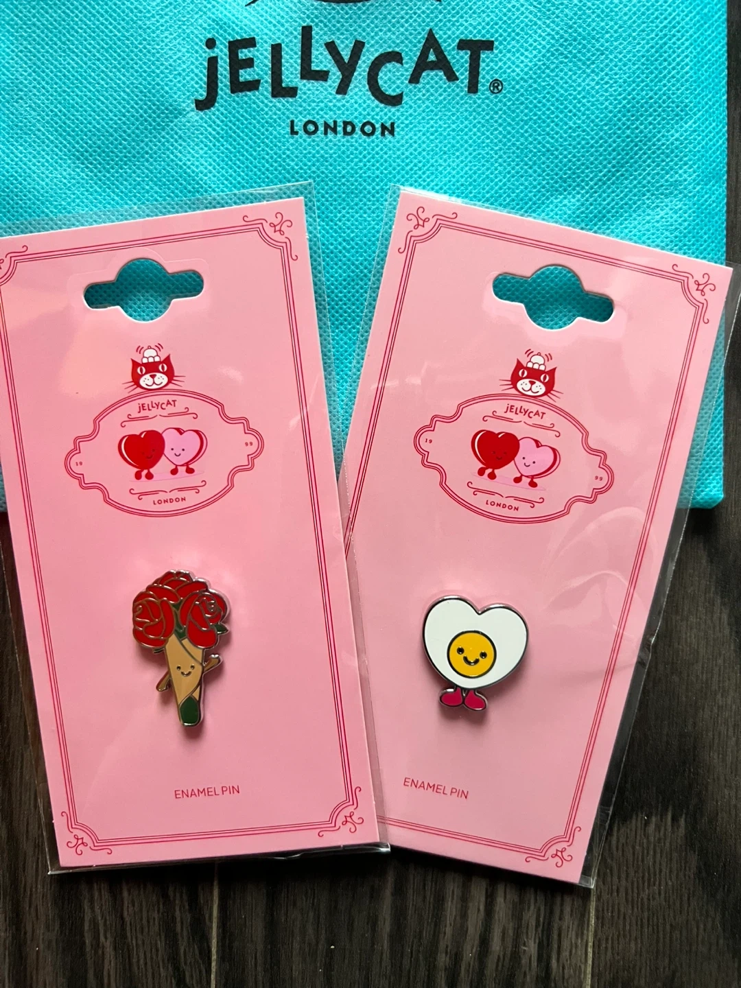 Two cute Jellycat London enamel pins, one features a rose bouquet and the other a smiling fried egg. These are perfect for adding a bit of fun to a jacket or bag! $25 each or $40 for both