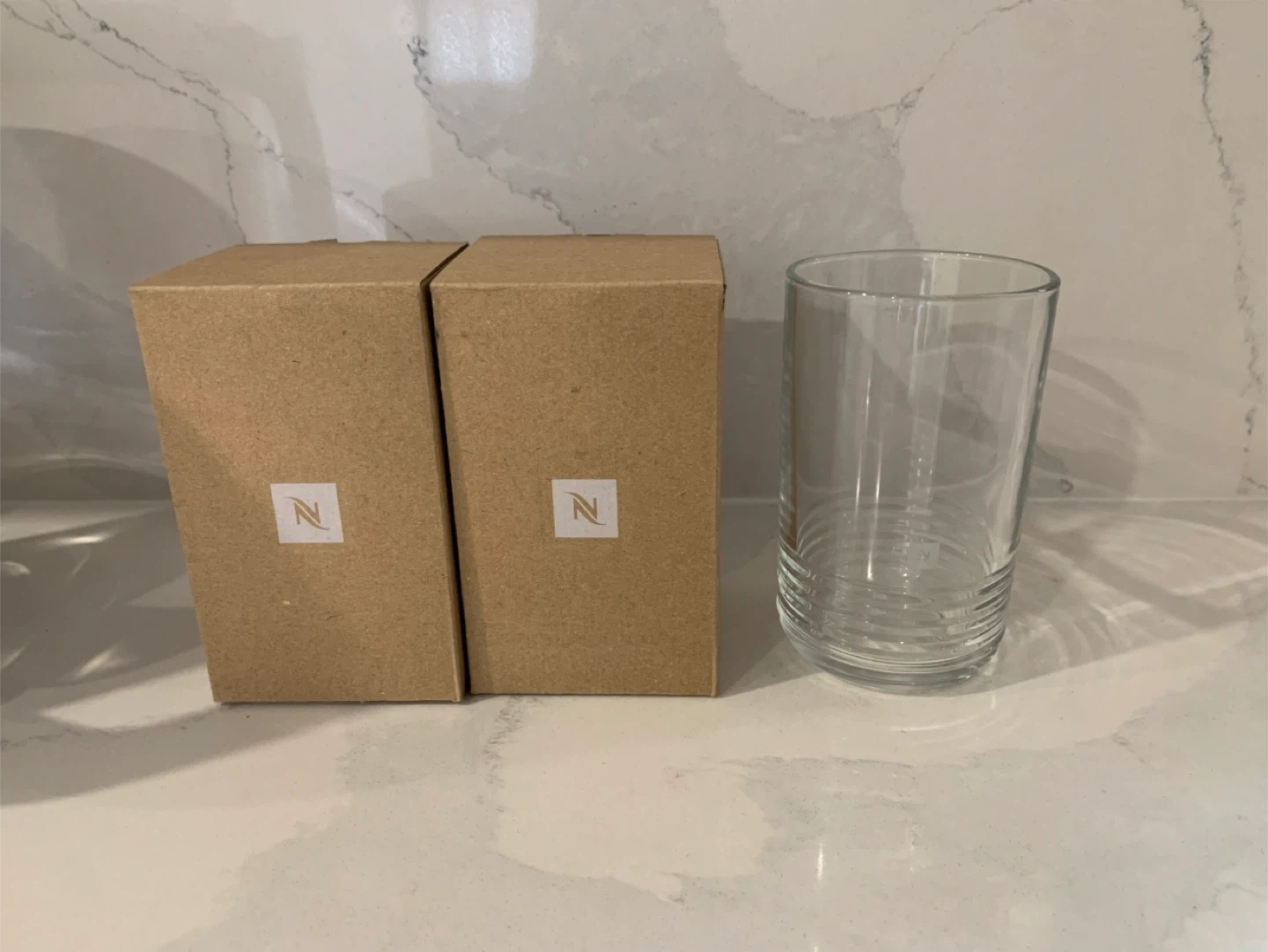 This is a set of two clear glass mugs from Nespresso. They're made of durable glass. These mugs are perfect for enjoying your favourite hot beverages.