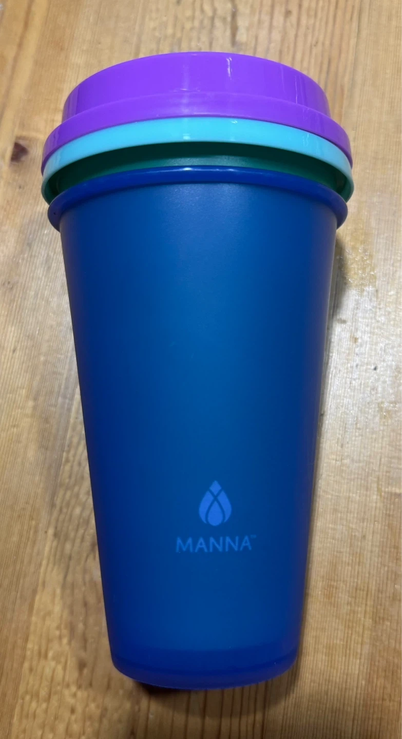 This is a set of Manna tumblers with lids. They're made of durable plastic. The set includes one blue tumbler with three different colored lids: purple, teal, and green.
