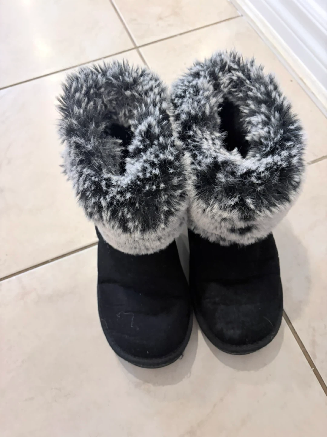 Cozy black winter boots with a stylish faux fur trim! These boots are perfect for keeping your feet warm and looking great during the colder months. They have a silver accent on the heel, adding a touch of sparkle to your winter wardrobe. The boots are in good condition and ready for a new owner!