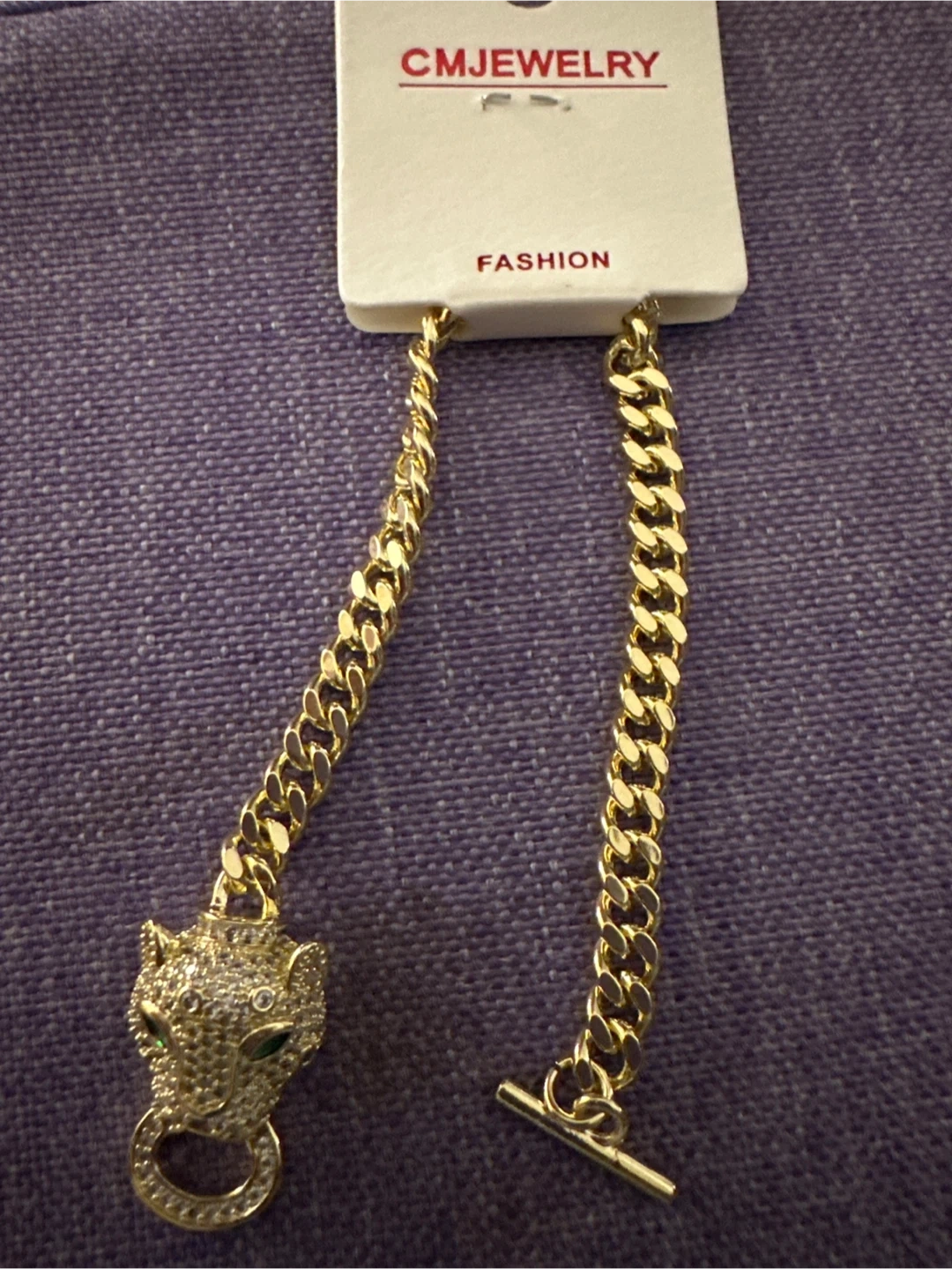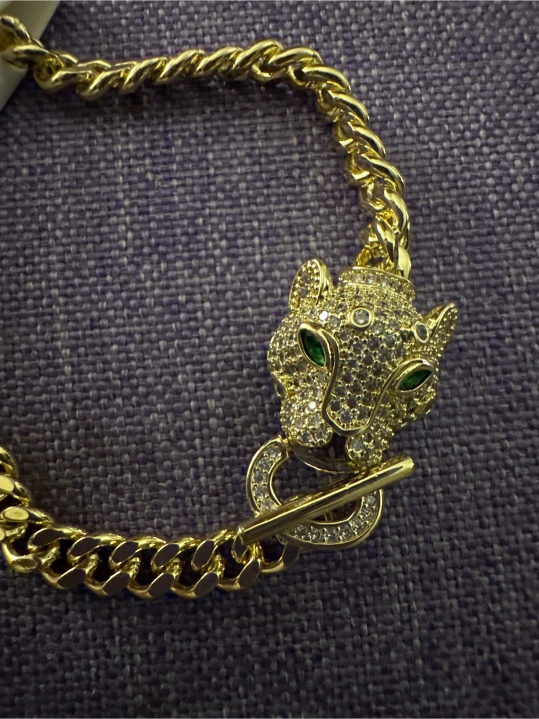 This bracelet features a chunky gold-tone chain with a detailed panther head charm. The panther is adorned with clear rhinestones and green emerald-like eyes. It has a toggle clasp closure. This piece adds a bold statement to any outfit!