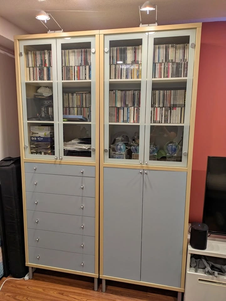 Moving Sale. Two IKEA MAGIKER Tall Cabinet, drawer & shelf combos in light blue. Dimensions: 27"W x 16"D x 84"H. Features glass doors on top shelves. One cabinet has 5 drawers, the other has wooden door shelves. Includes shelving lights. Used but no damage. They hold a lot of items. Pick up Mississauga West End. $70 each or $120 for both.