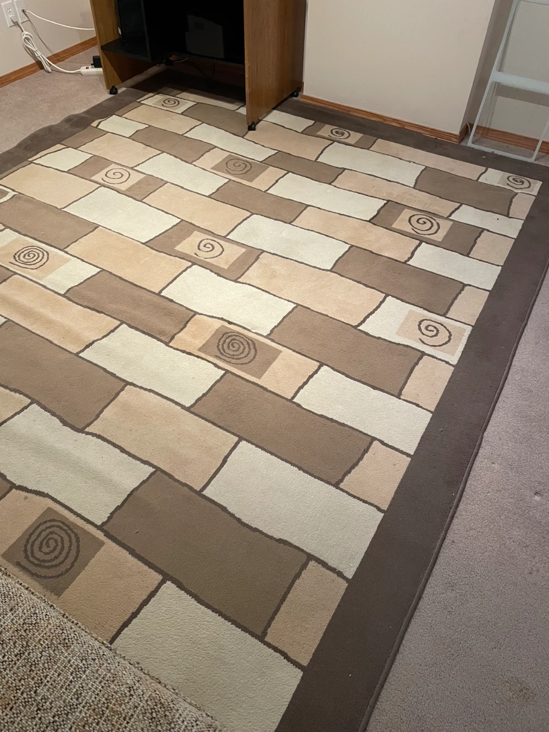 This area rug features a stylish block pattern with brown, beige, and cream colours. The design incorporates subtle swirl accents. It's a lovely addition to any living room or bedroom!