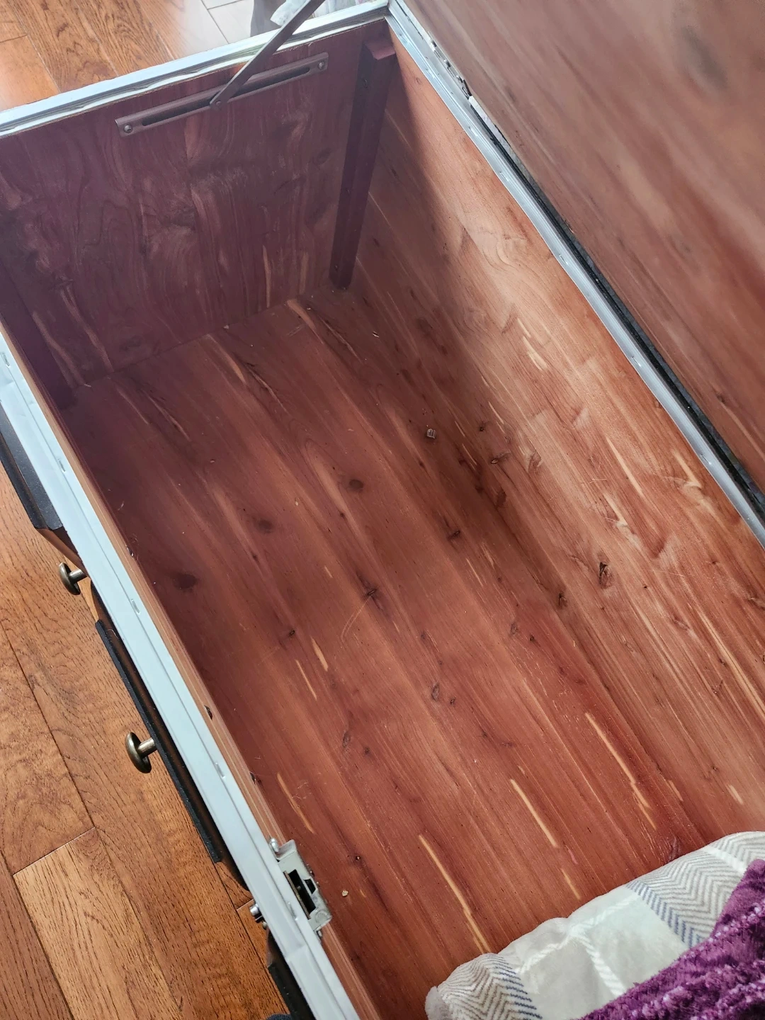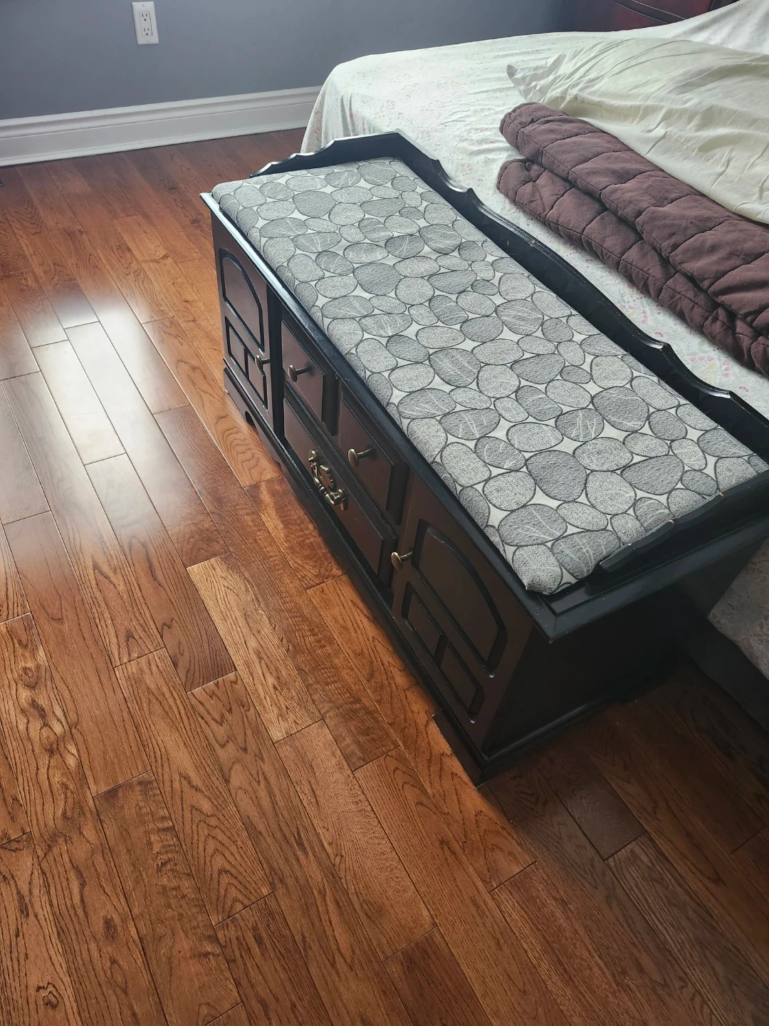 A lovely cedar chest with a padded upholstered top. It's perfect for storing blankets or linens. This bench offers both storage and seating.