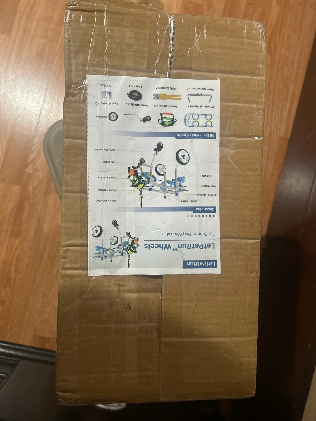 Selling a LetPetRun full support dog wheelchair. It comes with all included parts as shown on the box: wheelchair frame, front harness, front wheels, rear wheels, front connector, belly support, leash, and a toolbox