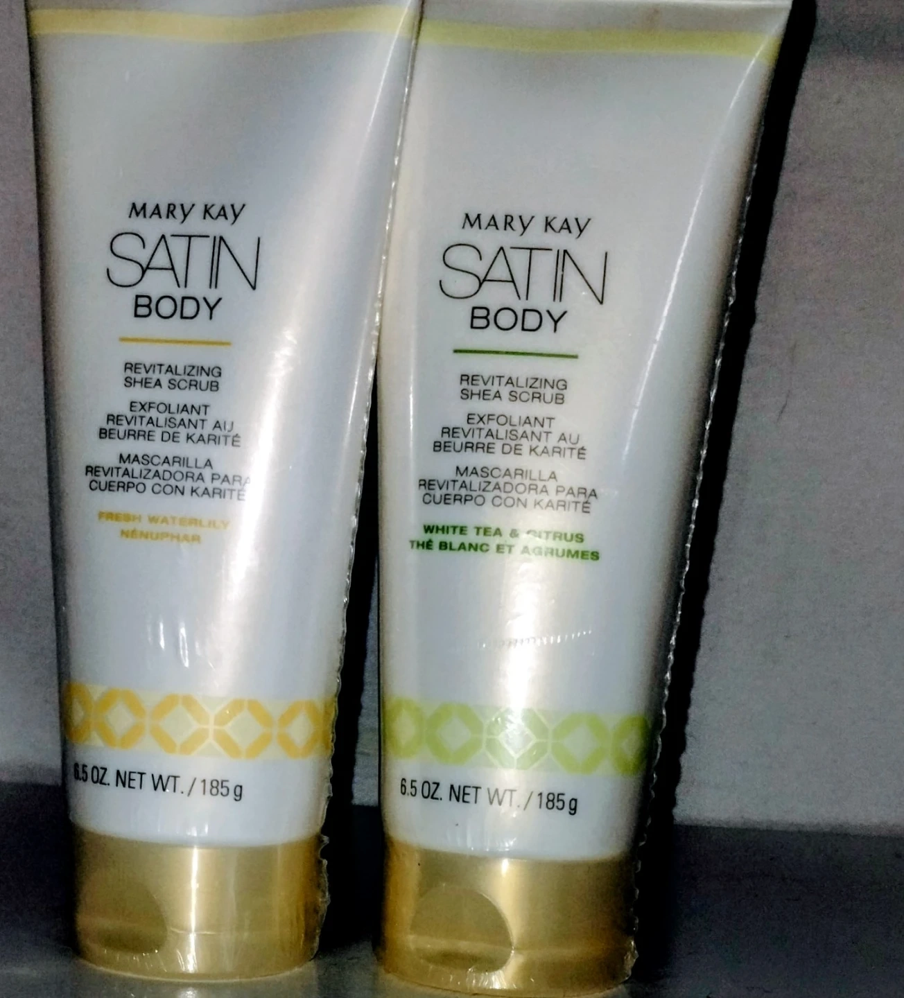 This set includes two Mary Kay Satin Body Revitalizing Shea Scrubs. One is Fresh Waterlily scent and the other is White Tea & Citrus. Each tube contains 6.5 oz net wt. / 185 g. It's a shea scrub with exfoliating properties.