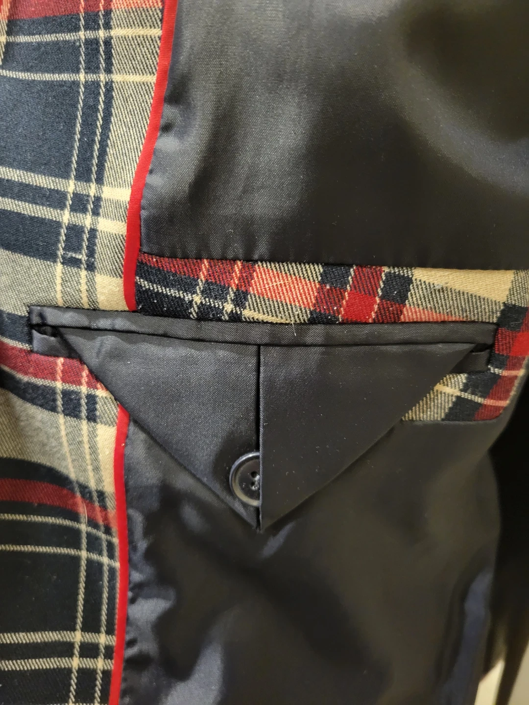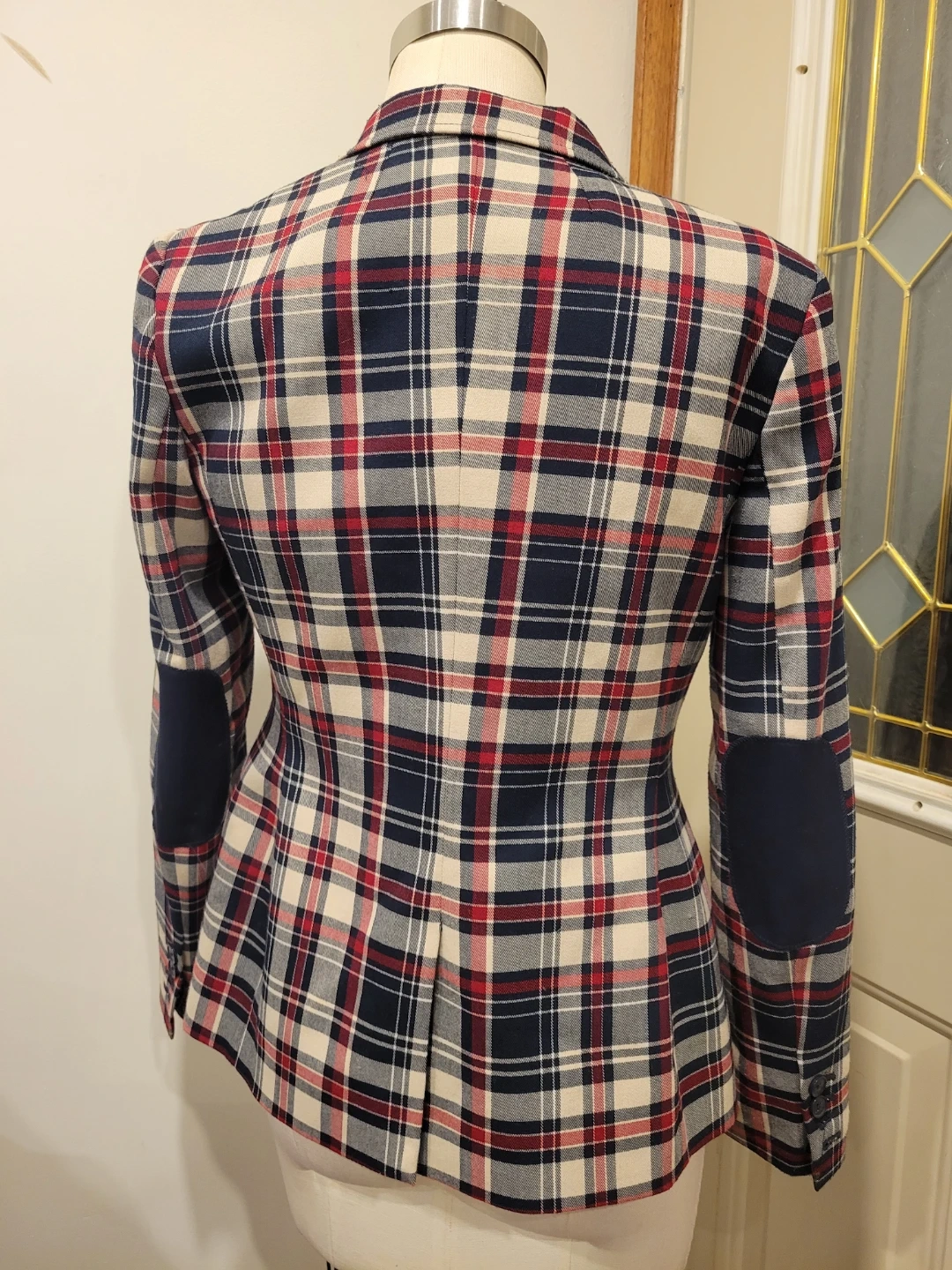 A classic Tommy Hilfiger blazer with a red, white, and blue plaid pattern. It features button closure and elbow patches. Made in Vietnam. From a smoke free home meetup location eglinton and dufferin area, Price is Firm!!