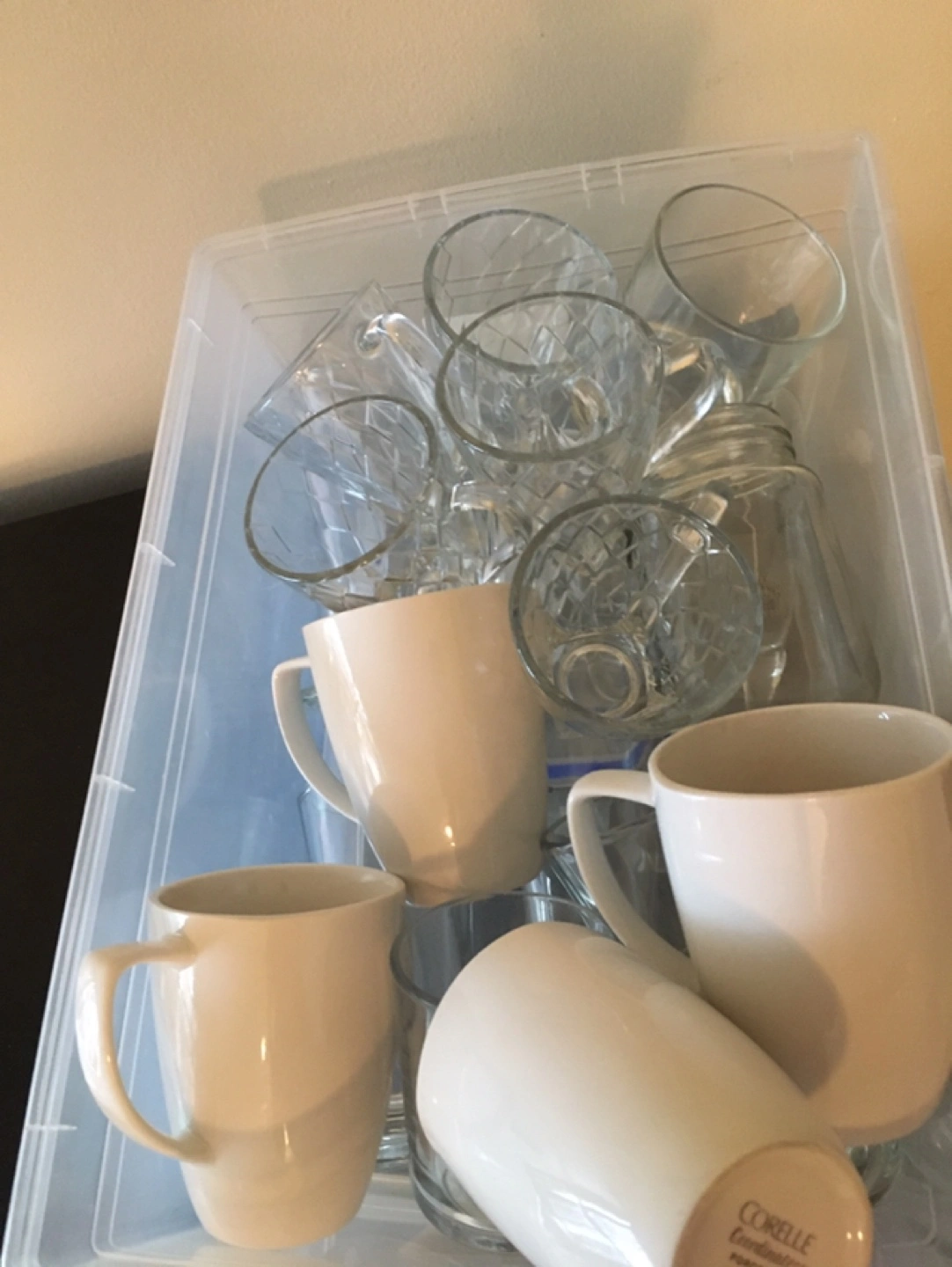 This is a collection of assorted mugs and glassware. It includes several cream-coloured ceramic mugs. Various styles of clear drinking glasses are included. Perfect for stocking up your kitchen cabinets!