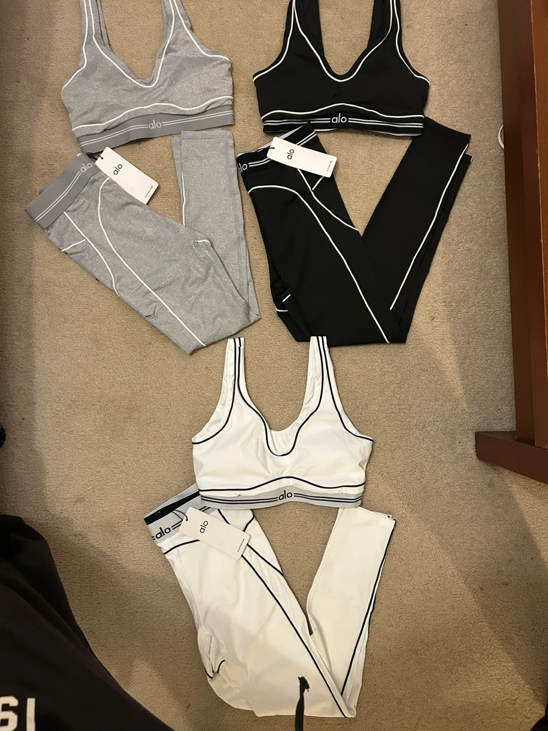This set includes three Alo Yoga sports bras and three pairs of matching leggings in grey, black, and white. They're designed for comfort and performance. Made from stretchy, breathable fabric.