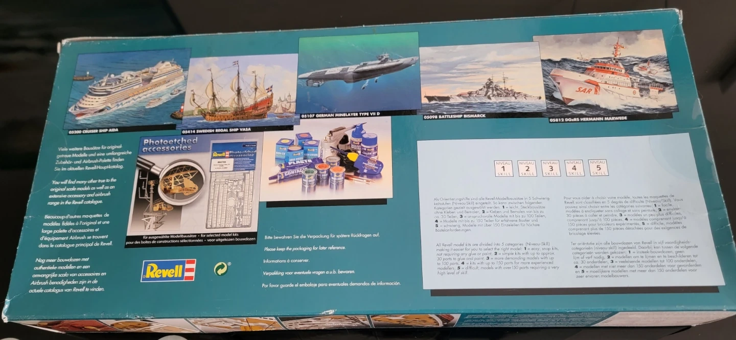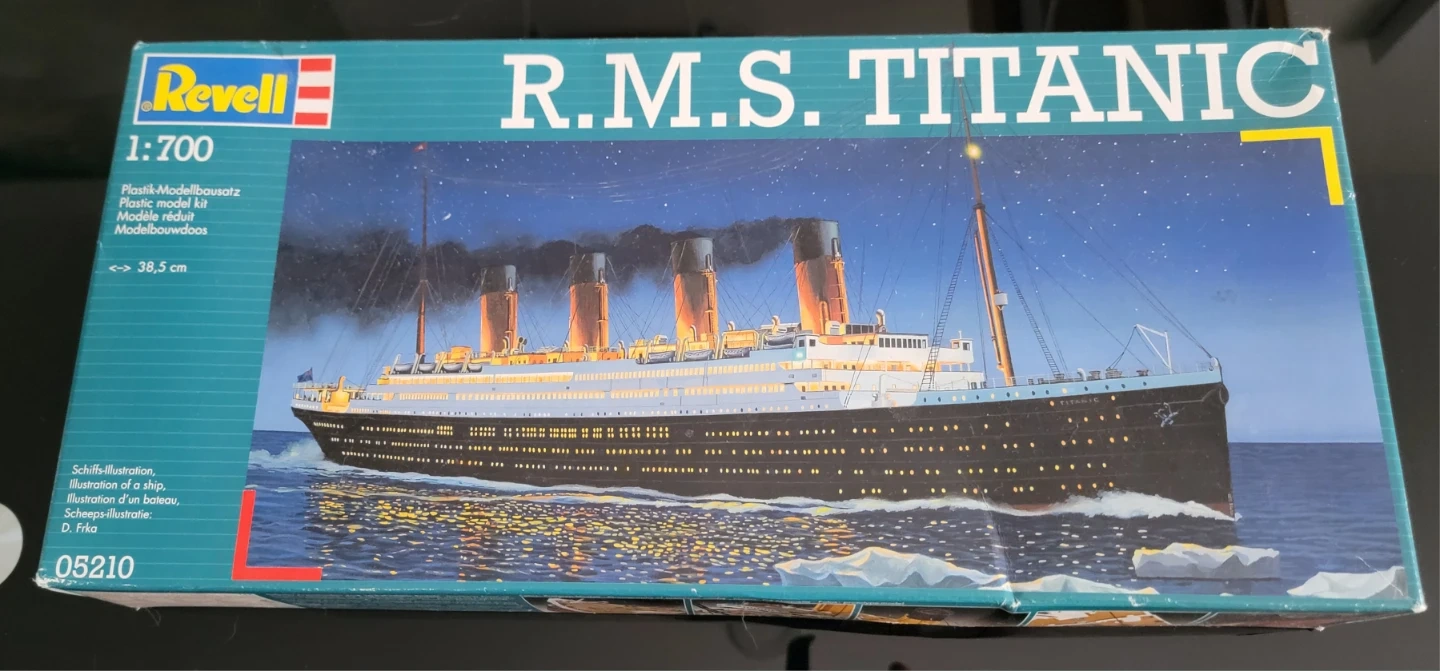 This is a Revell R.M.S. Titanic 1:700 scale plastic model kit. The kit includes plastic model parts for building the ship. Model length is approximately 38.5 cm.